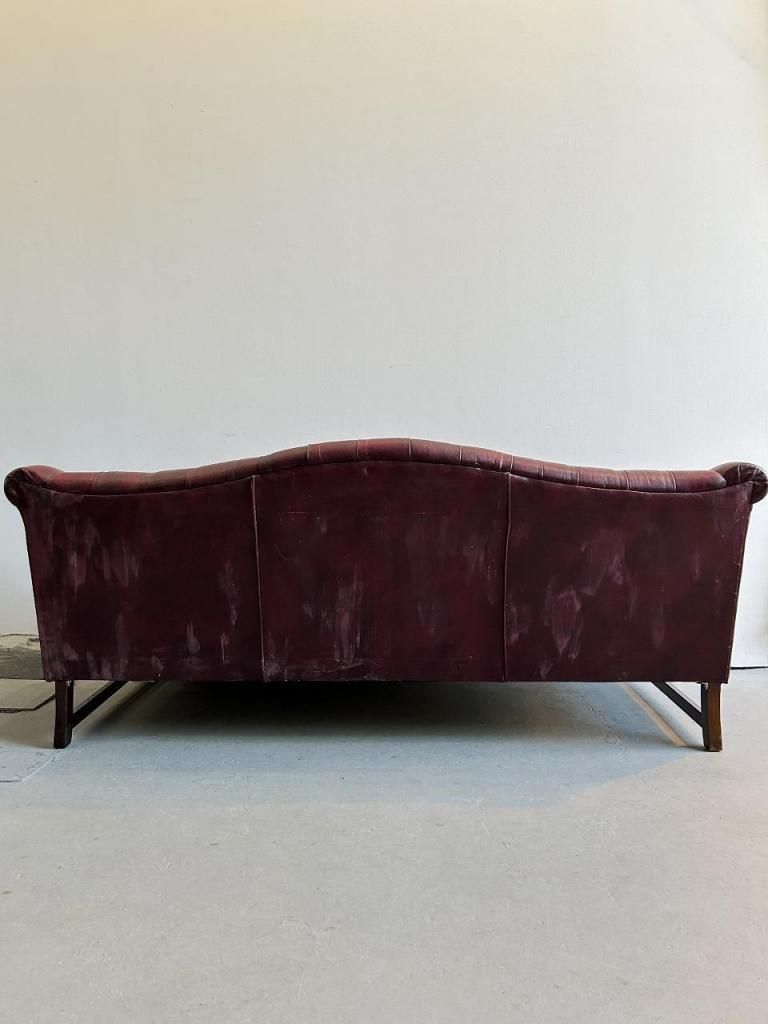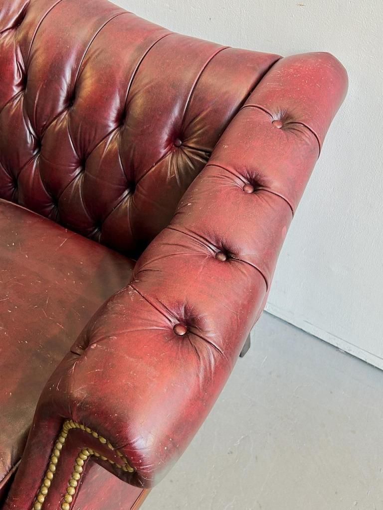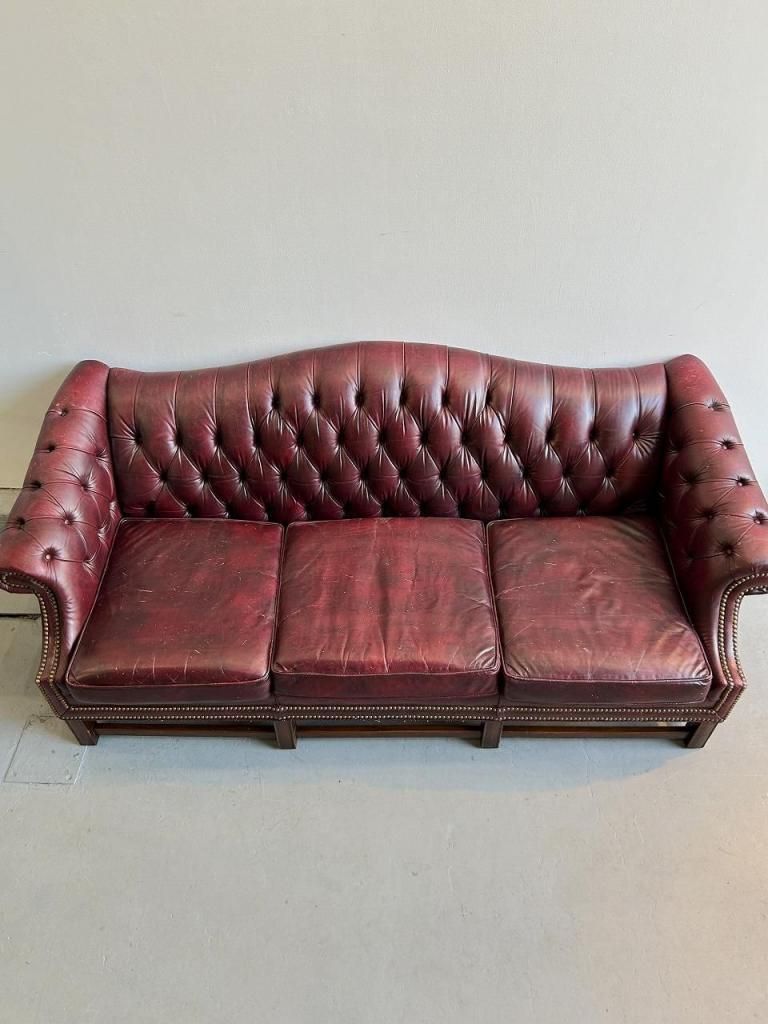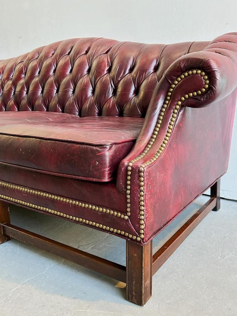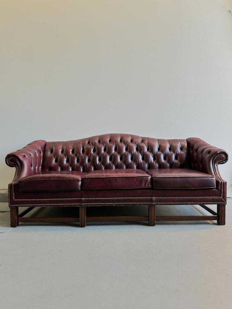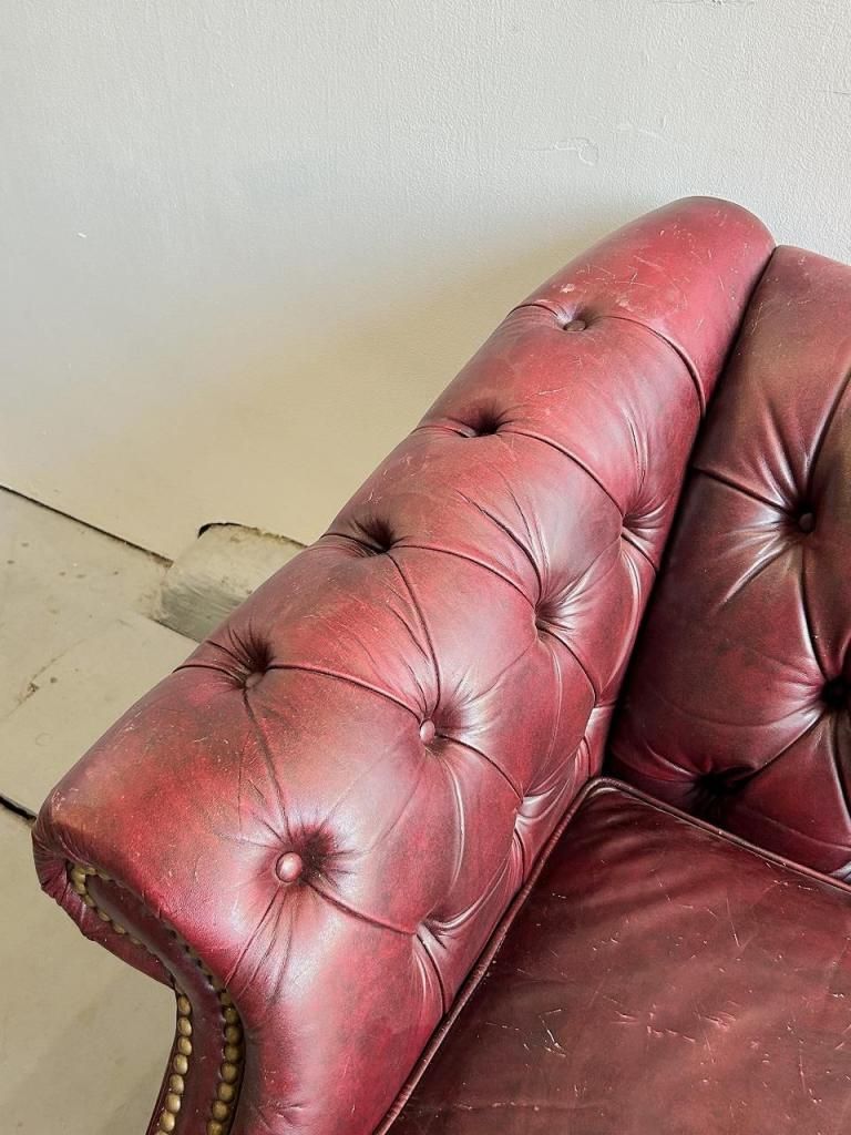背からアームにかけて緩やかに波打つラインと、細かく深く沈んだボタンダウンの表情が、英国チェスターフィールドを思わせる重厚さを演出しています。