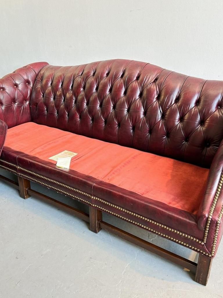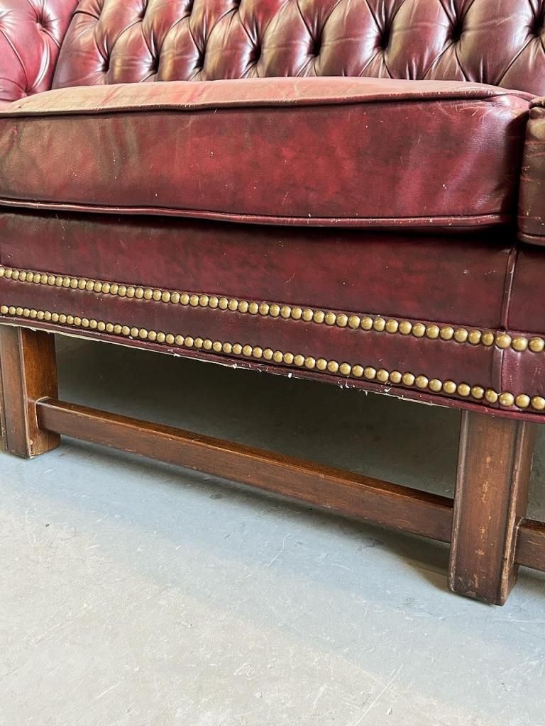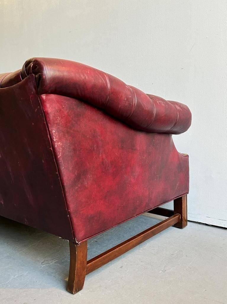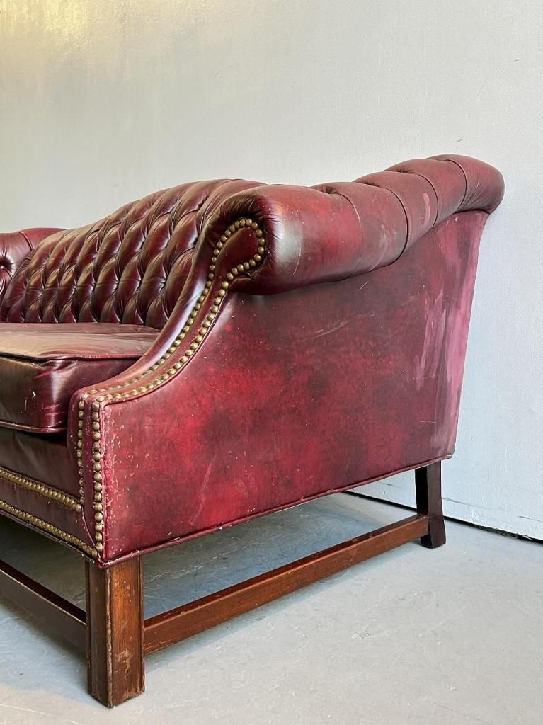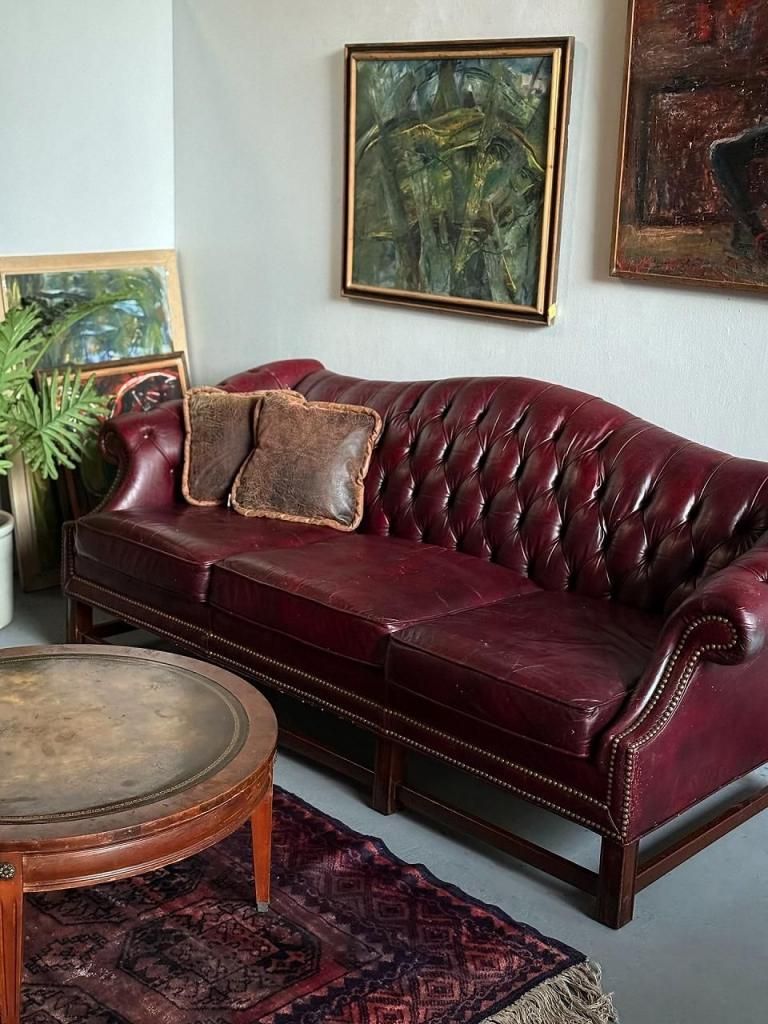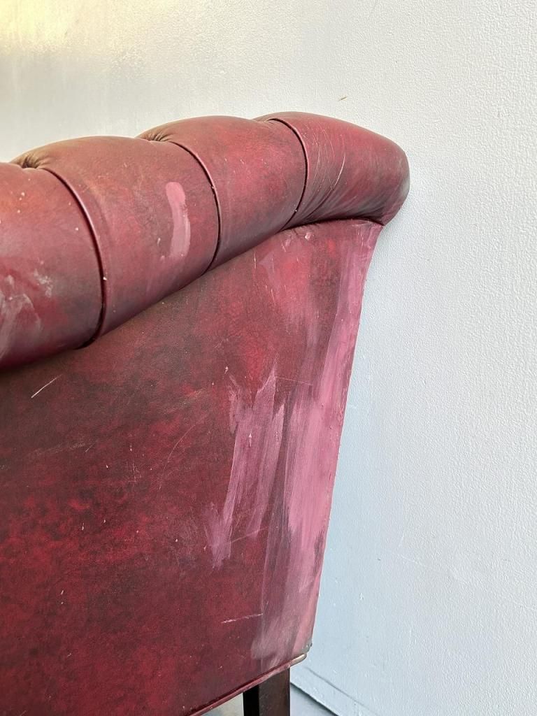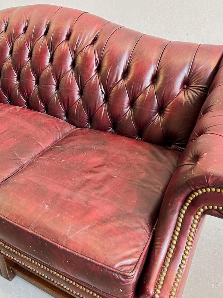 背からアームにかけて緩やかに波打つラインと、細かく深く沈んだボタンダウンの表情が、英国チェスターフィールドを思わせる重厚さを演出しています。