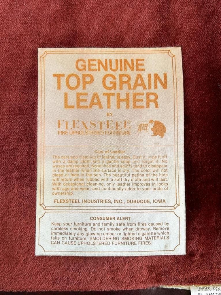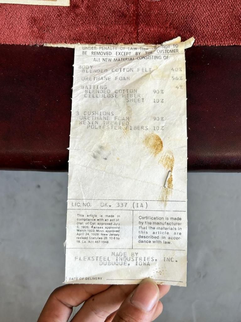 Flexsteel社は1893年創業、アメリカを代表する老舗メーカーです。特に耐久性の高いスチールスプリング構造(“Blue Steel Spring”)が有名で、長年使用できる堅牢な造りが評価されています。このソファもその品質の高さが伺え、腰のある座り心地としっかりした骨格が保たれています。