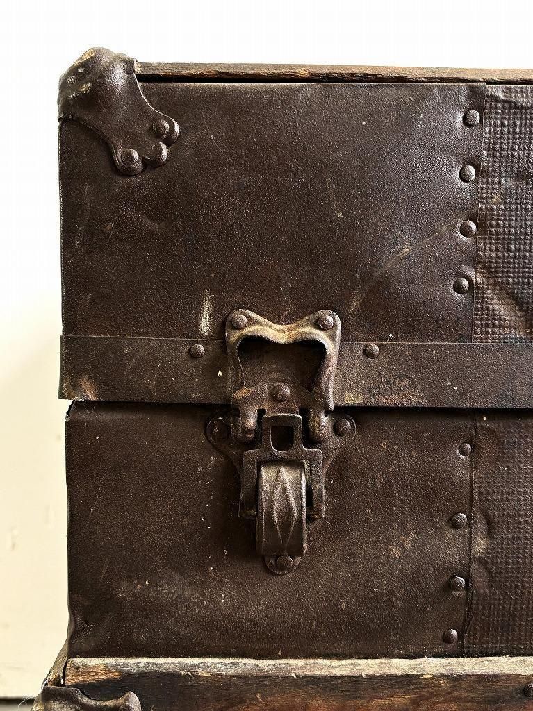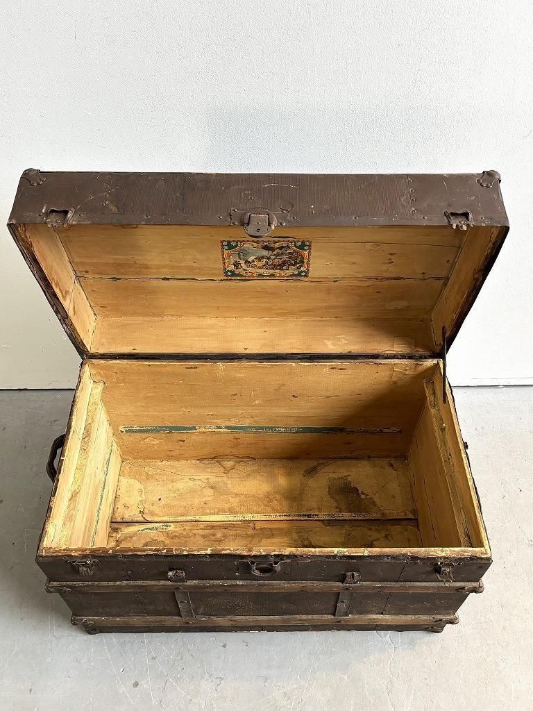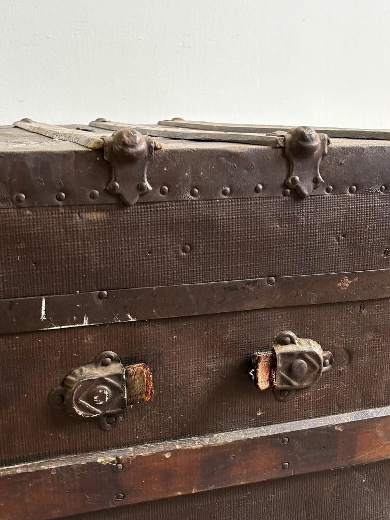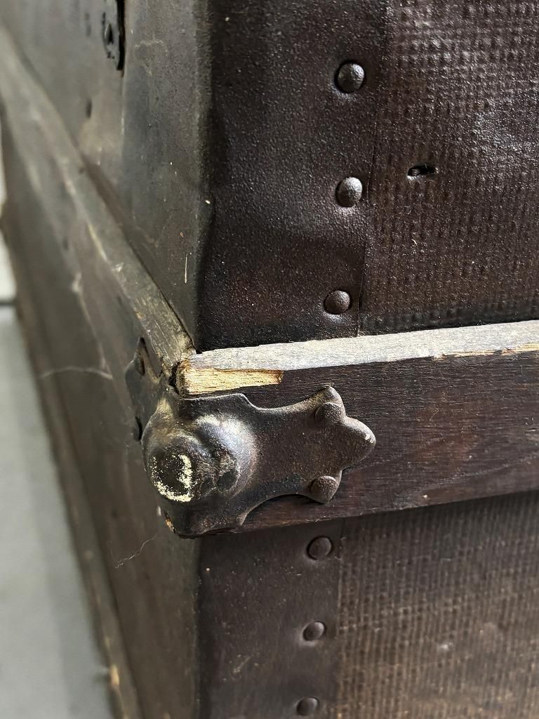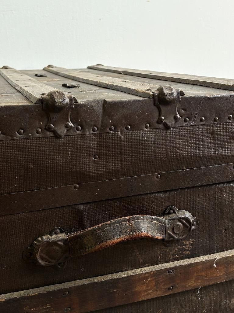 アメリカで1920-30年代に製造されたスチーマートランク(Steamer Trunk / Cabin Trunk)。当時の旅行用トランクの典型的な構造を持ち、ハードな旅や長期移動に耐える実用家具として作られたものです。