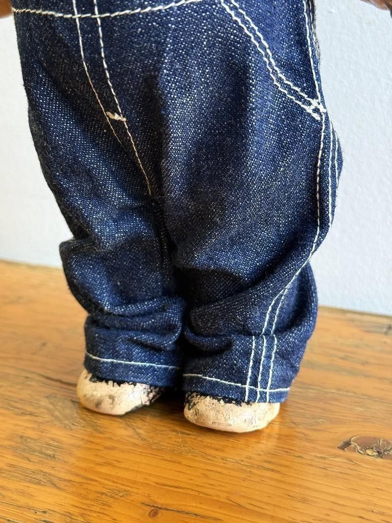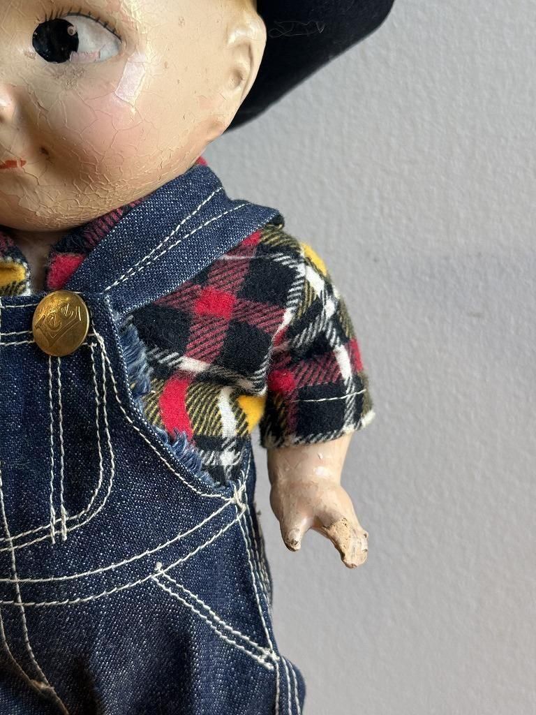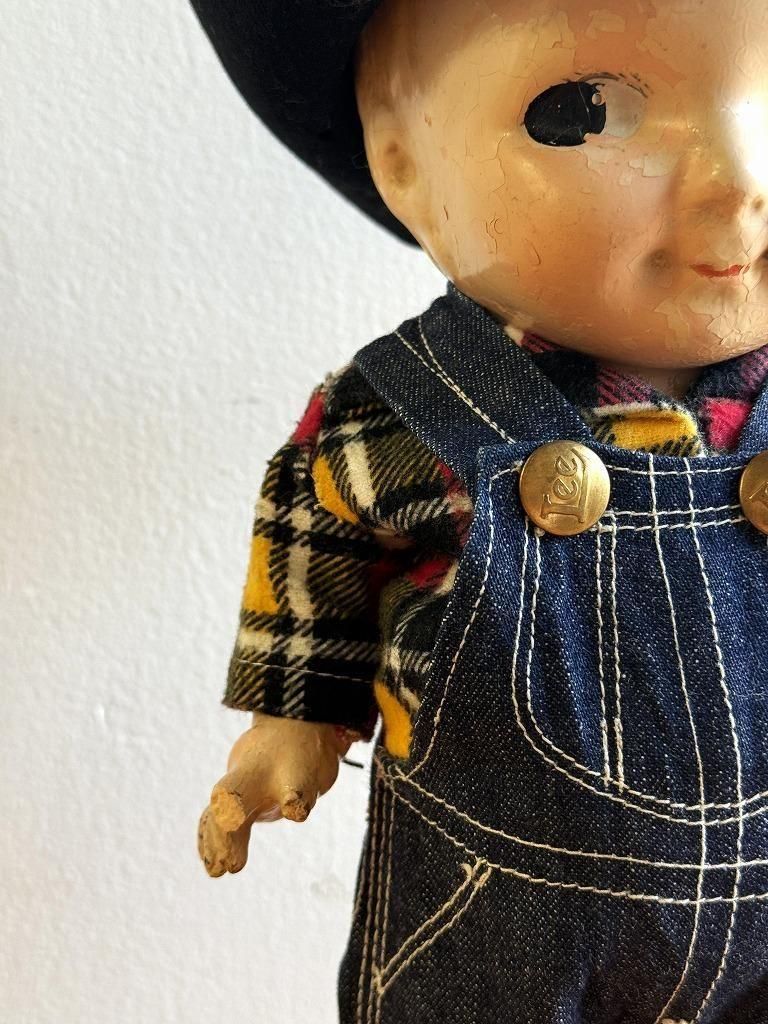 本体は、木粉・膠・石膏などを混ぜ合わせた コンポジション素材で成型された、初期から中期(1920-1940年代)の典型的な仕様になっております。着用している オーバーオール、シャツ、帽子はすべて当時の Lee オリジナル衣装で揃った大変貴重な一点です。