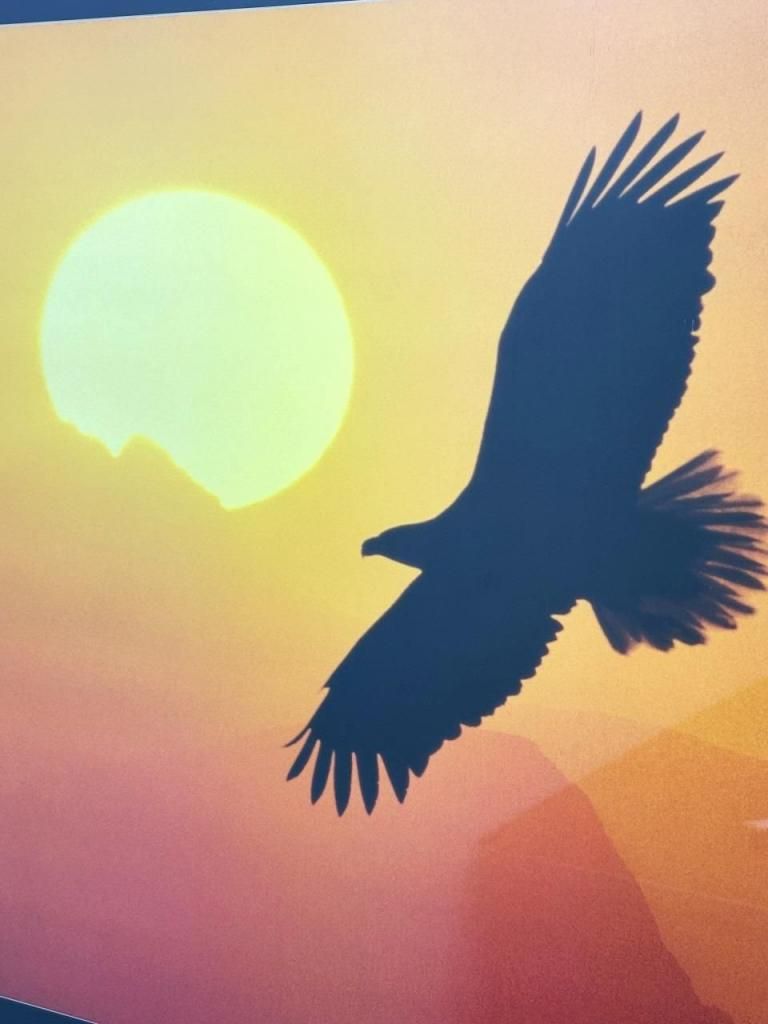夕日に向かって大きく翼を広げるイーグルがシルエットで描かれた力強い一枚。