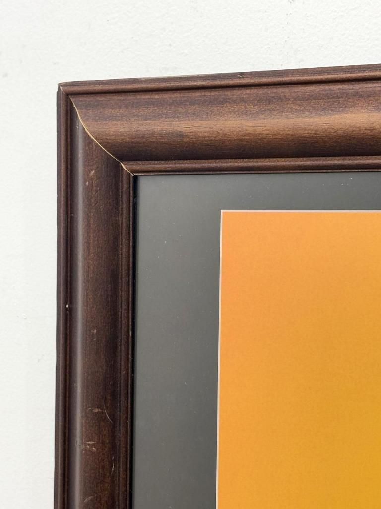 深いブラウンのフレームが温かみのある夕日の色合いと調和し、インテリアとしても飾りやすい印象です。