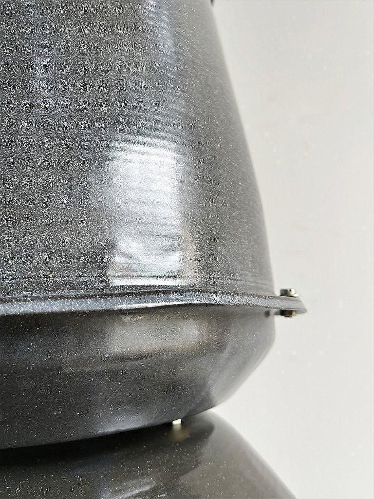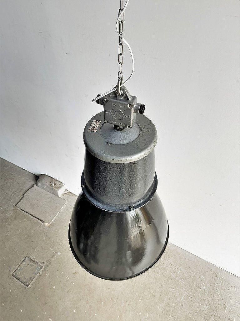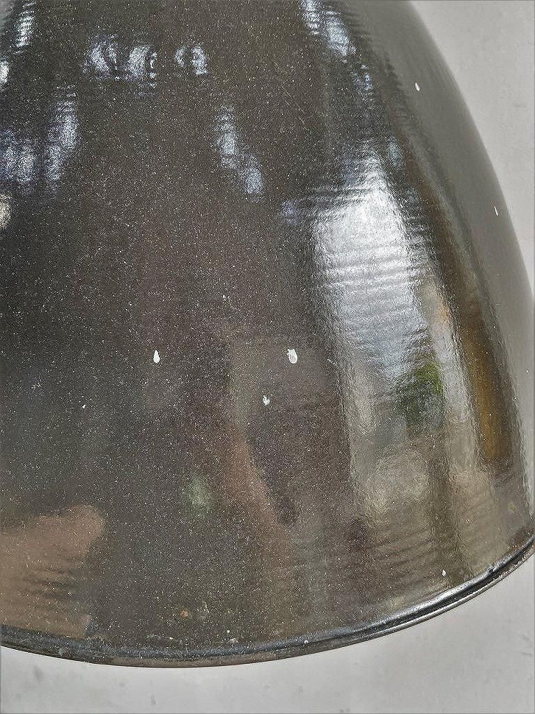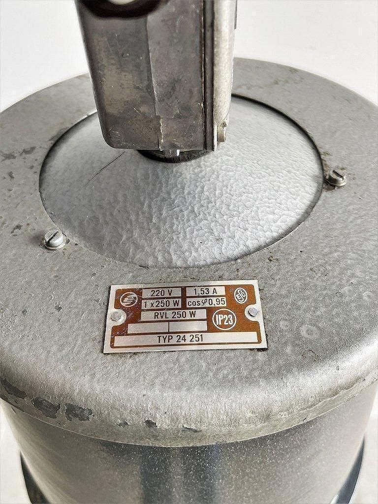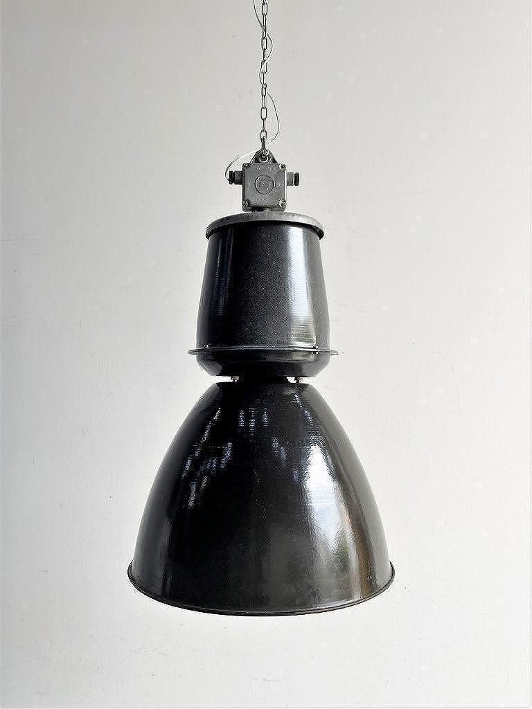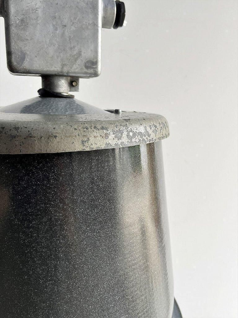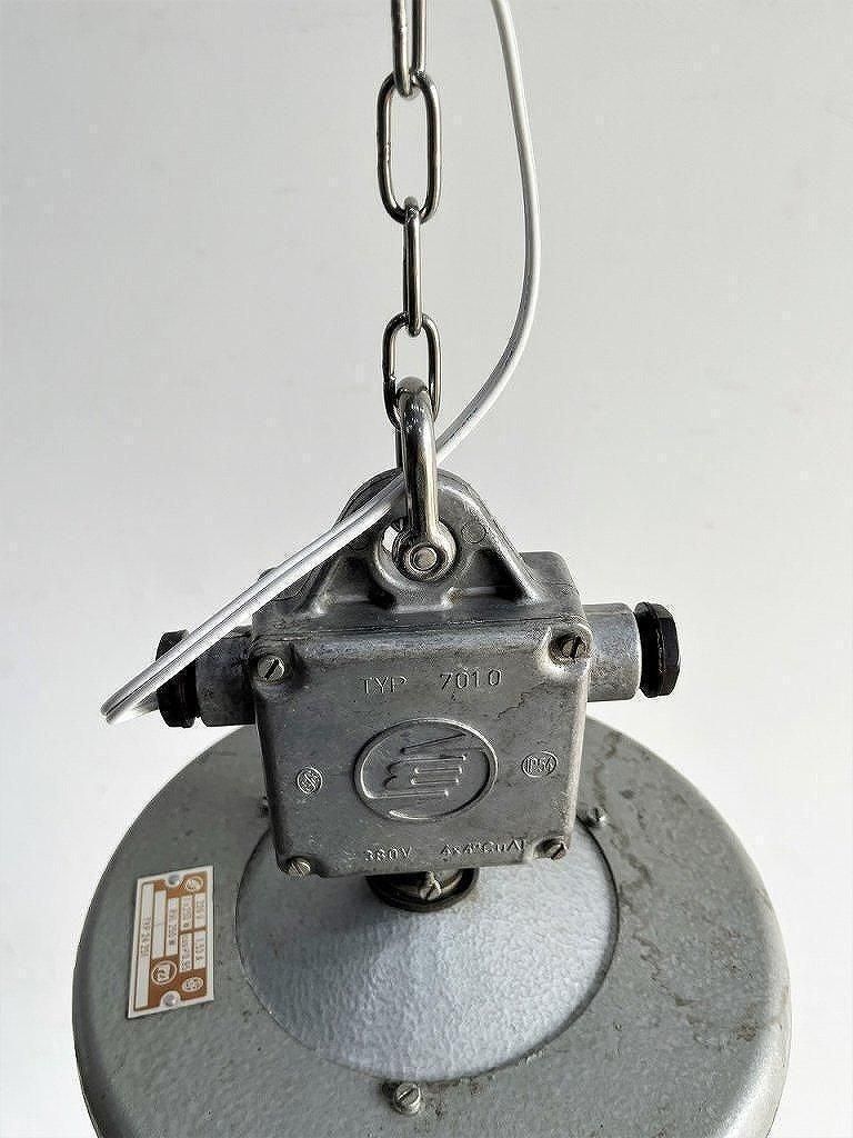 パーツそれぞれが工場用照明らしい堅牢なつくりで、約9-10kgという重量も当時の産業用規格ならではです。特に上部のメカニカルなディテールは、近年の量産照明では見られない存在感を放ちます。