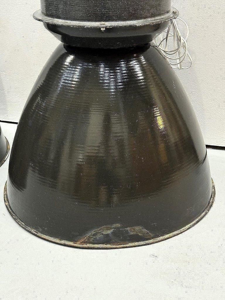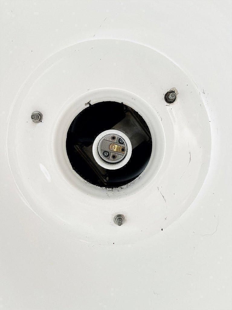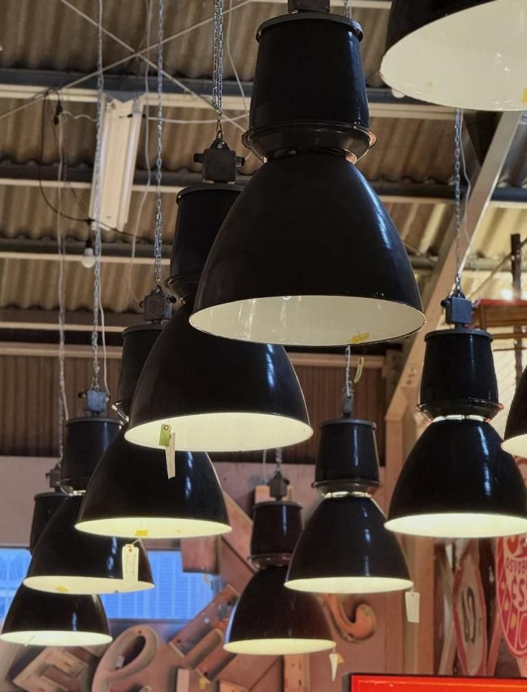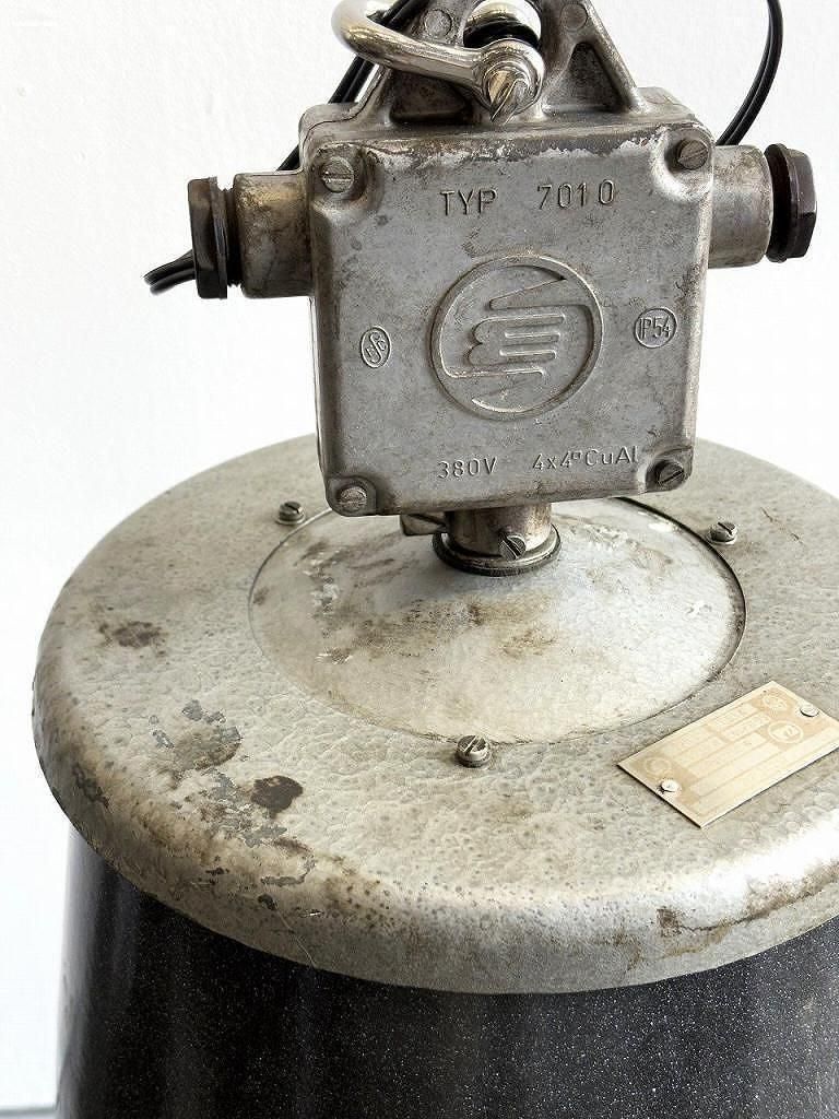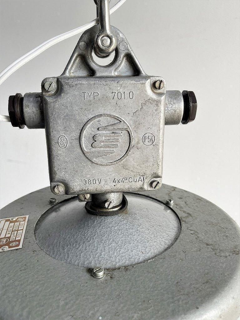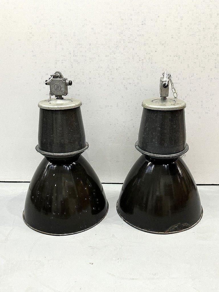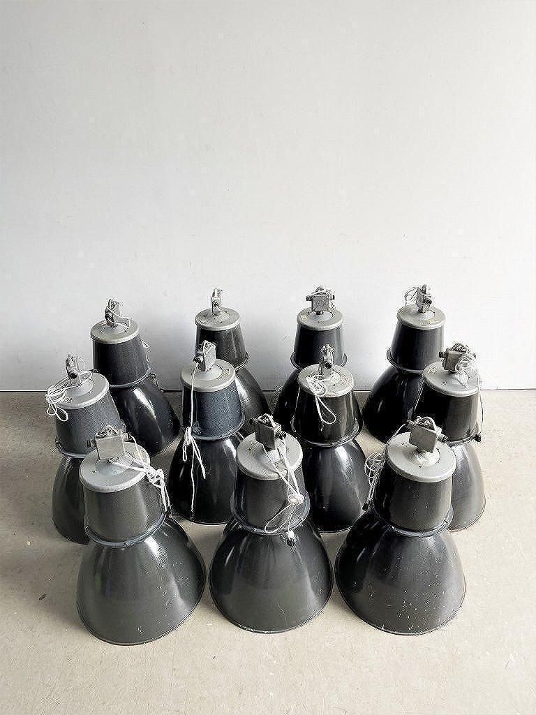 パーツそれぞれが工場用照明らしい堅牢なつくりで、約9-10kgという重量も当時の産業用規格ならではです。特に上部のメカニカルなディテールは、近年の量産照明では見られない存在感を放ちます。