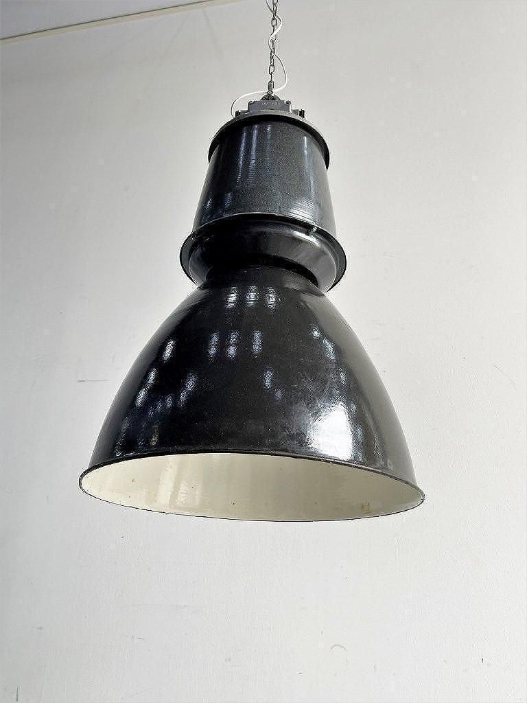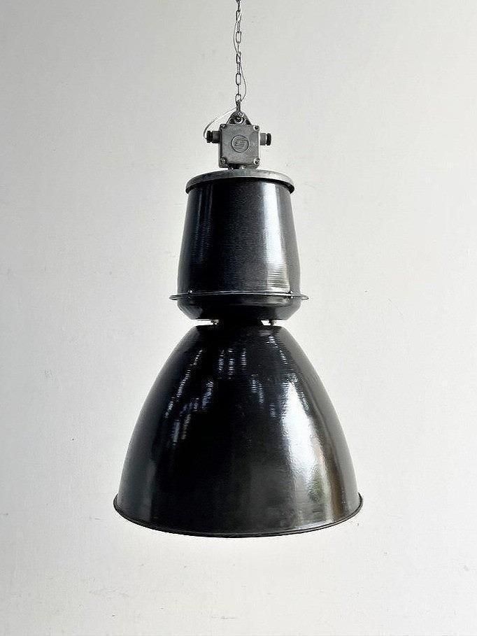 高さ87cmとインパクト抜群で、無骨なスチールボディと、深い艶を帯びたブラックエナメルシェードが組み合わさった、東欧ならではの重厚な佇まいが魅力の一灯。
