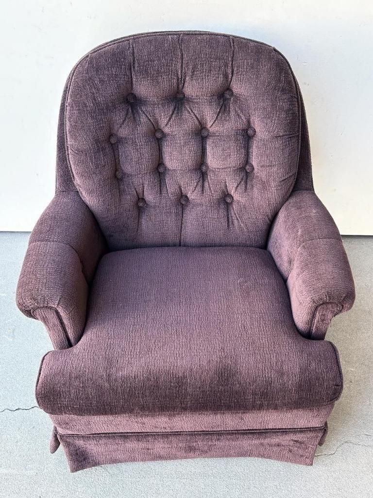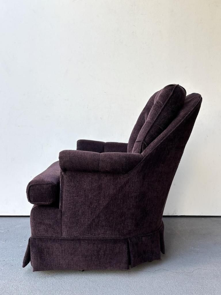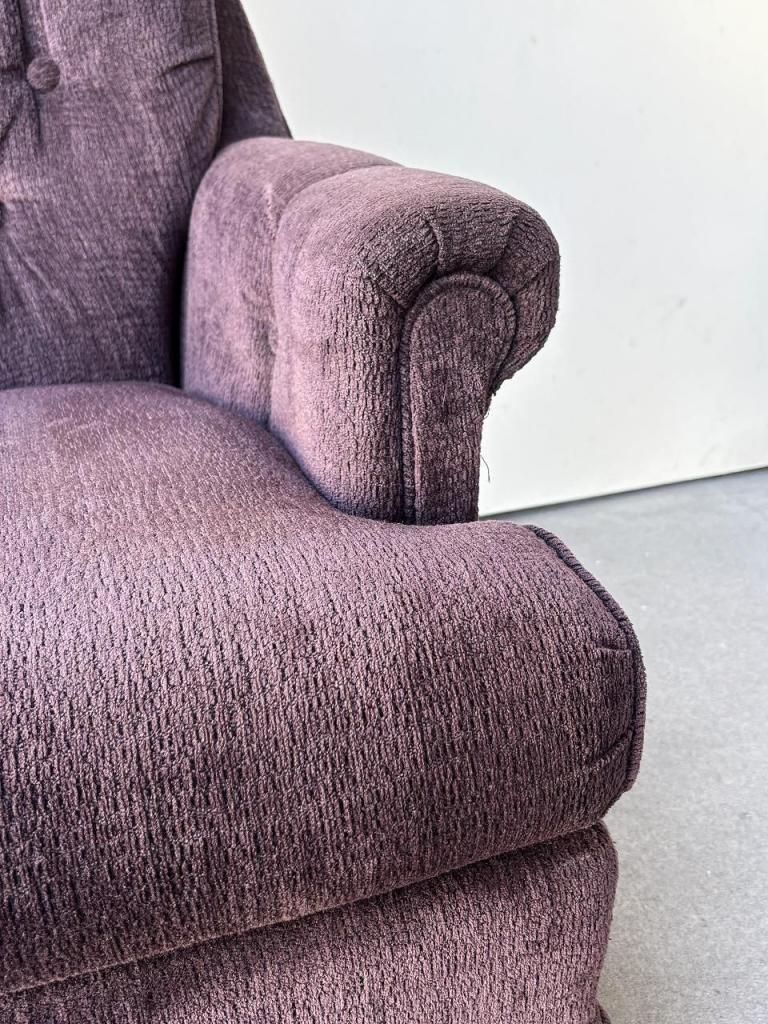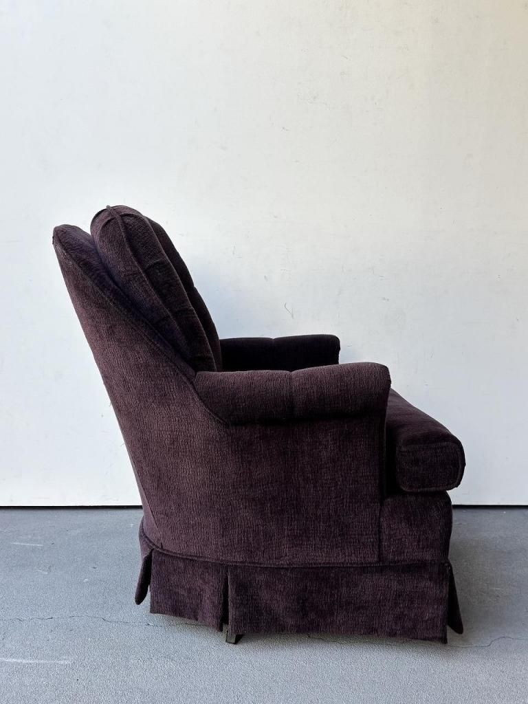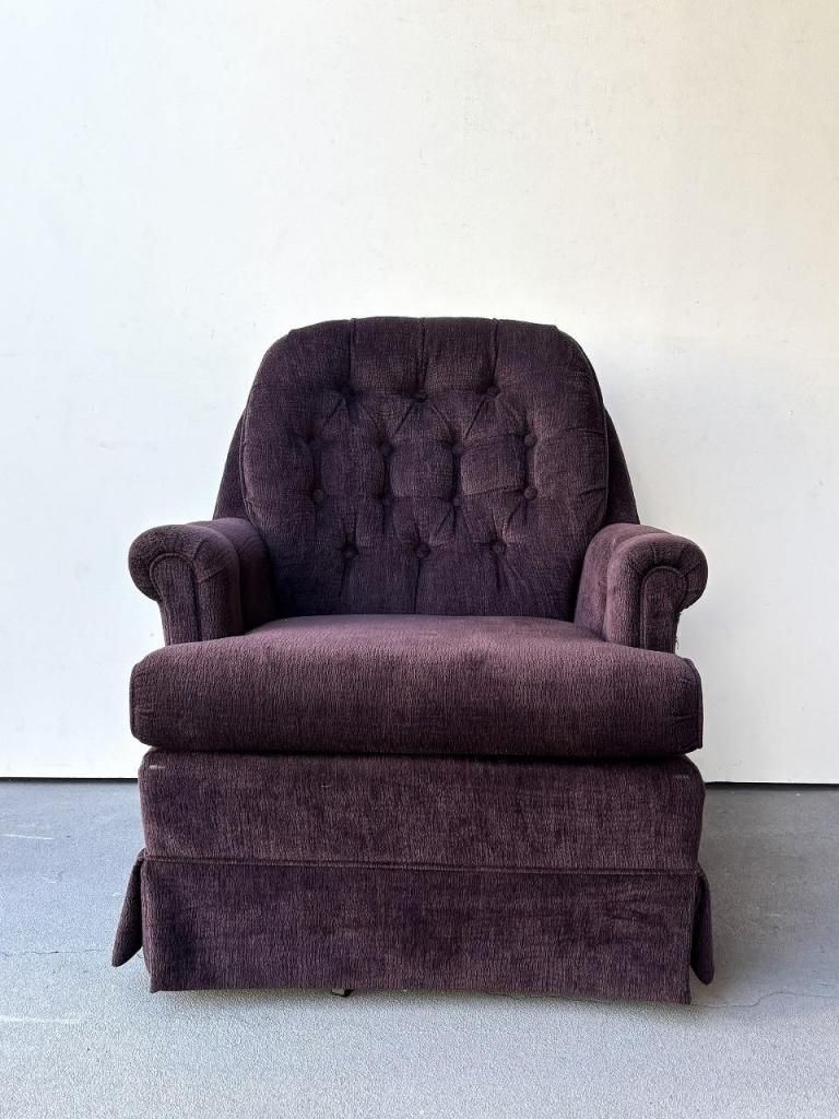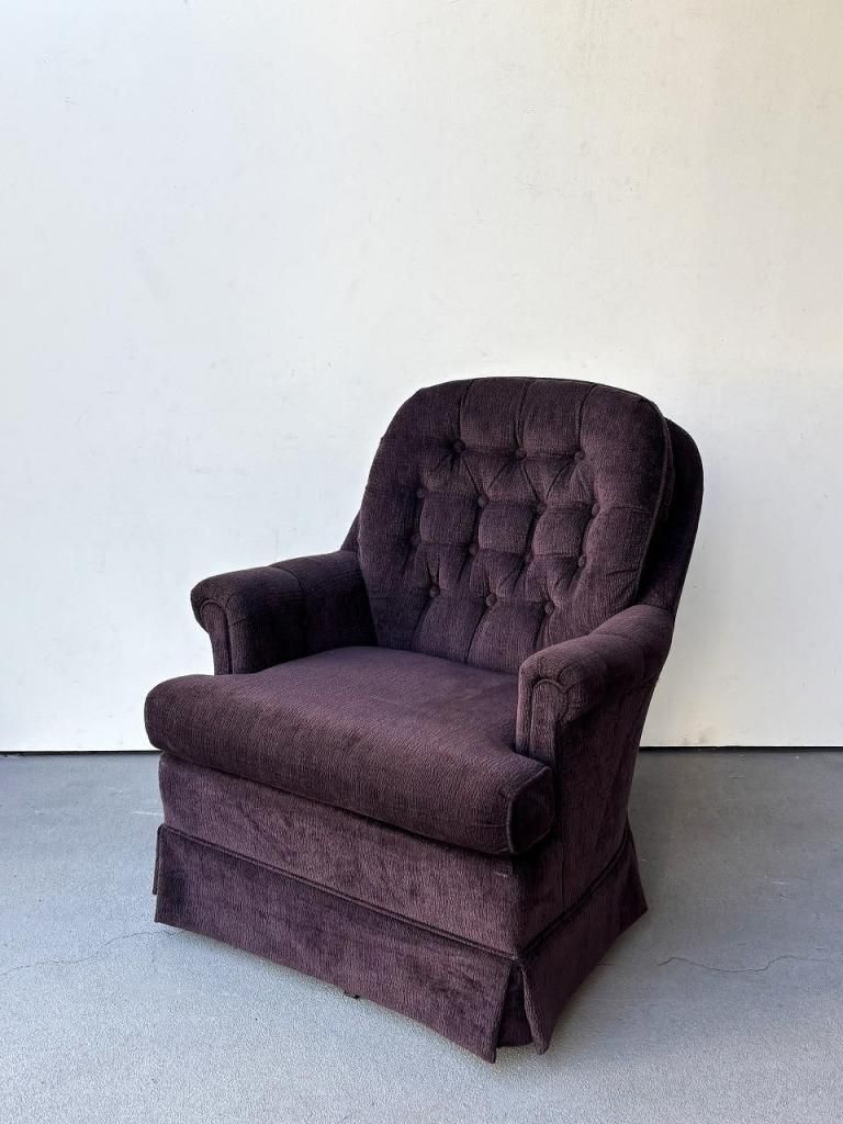 本品は、背もたれの深いボタンタフティングと、ふっくらとしたアームのラインが美しい、クラシカルなアメリカンスタイルの一脚。
