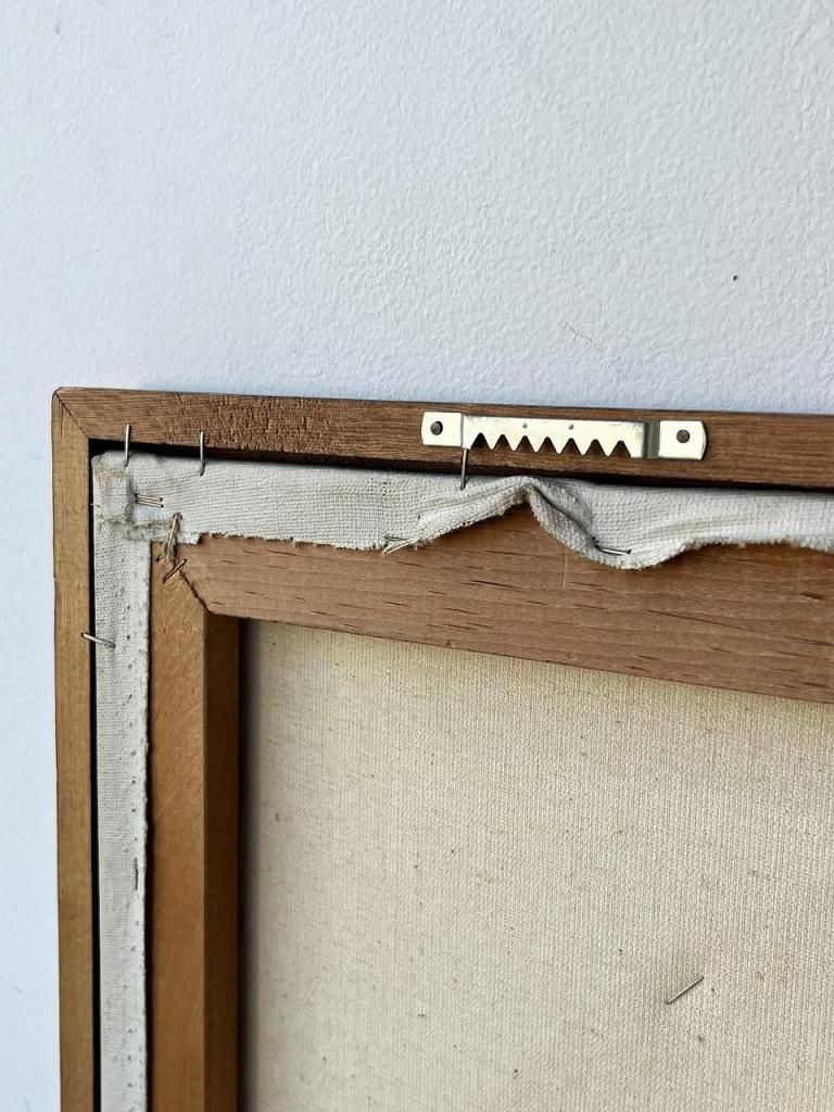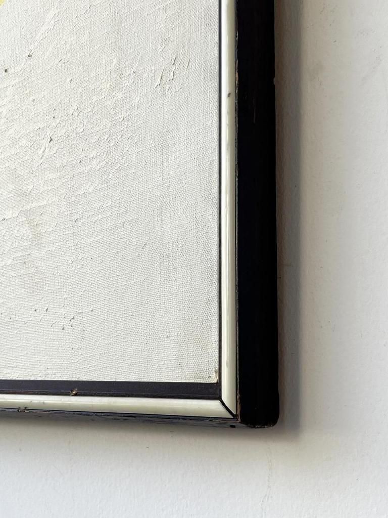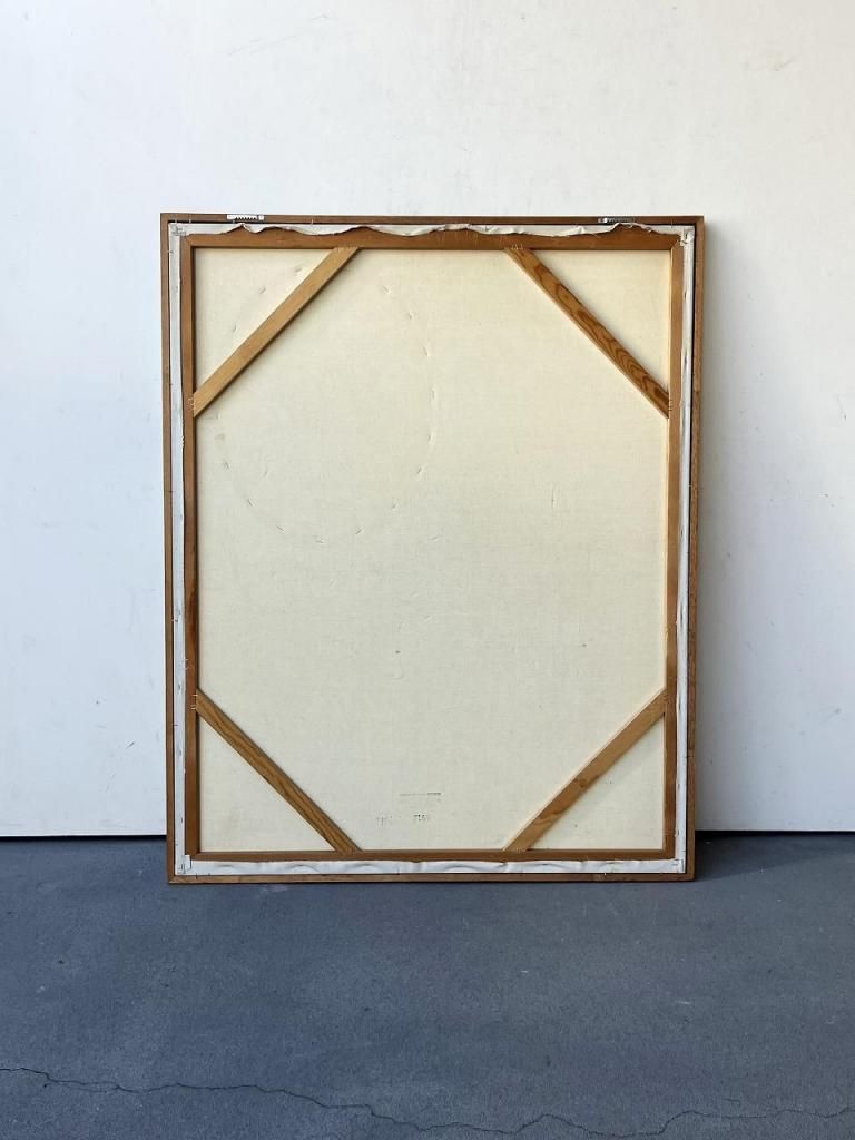 同じキャンバス上に描かれているにもかかわらず、まるで別作品をコラージュしたような立体的デザインが、70年代アートらしい遊び心を強く感じさせます。