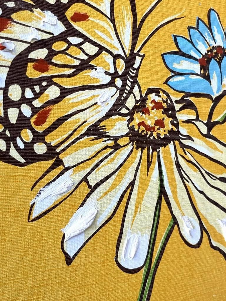 イエローを基調とした柔らかなトーンの中に、デイジーの群生と古びたウッドフェンス、そして大きく羽を広げたバタフライが描かれた、どこか懐かしい雰囲気とポップアートが交差する1枚。