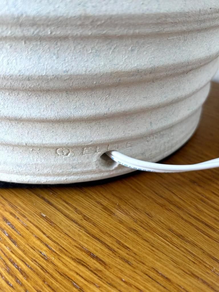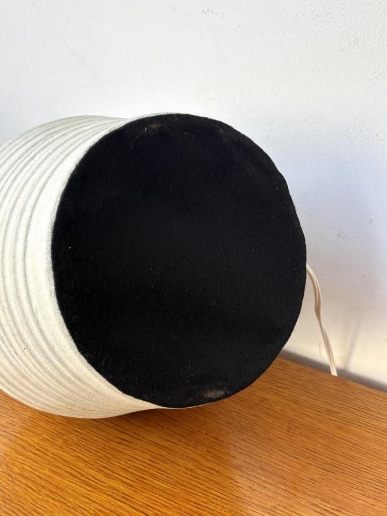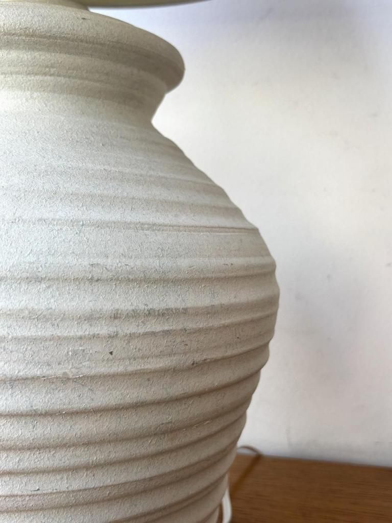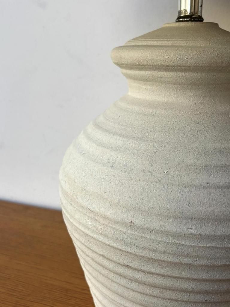 淡いアイボリーの陶器ベースに、ろくろ状のリズミカルな削り跡と手仕事のテクスチャーがそのまま活かされた一灯。