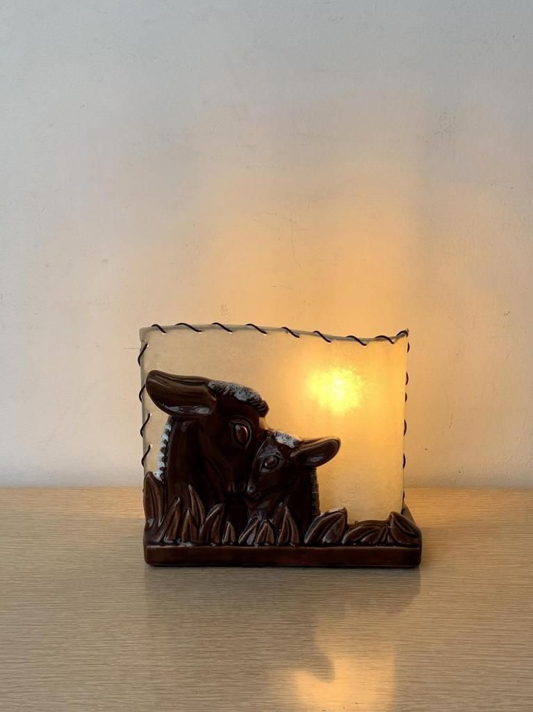 親子の鹿をかたどったセラミックベースと、レースで縁取られたファイバーシェードが組み合わされた一台。