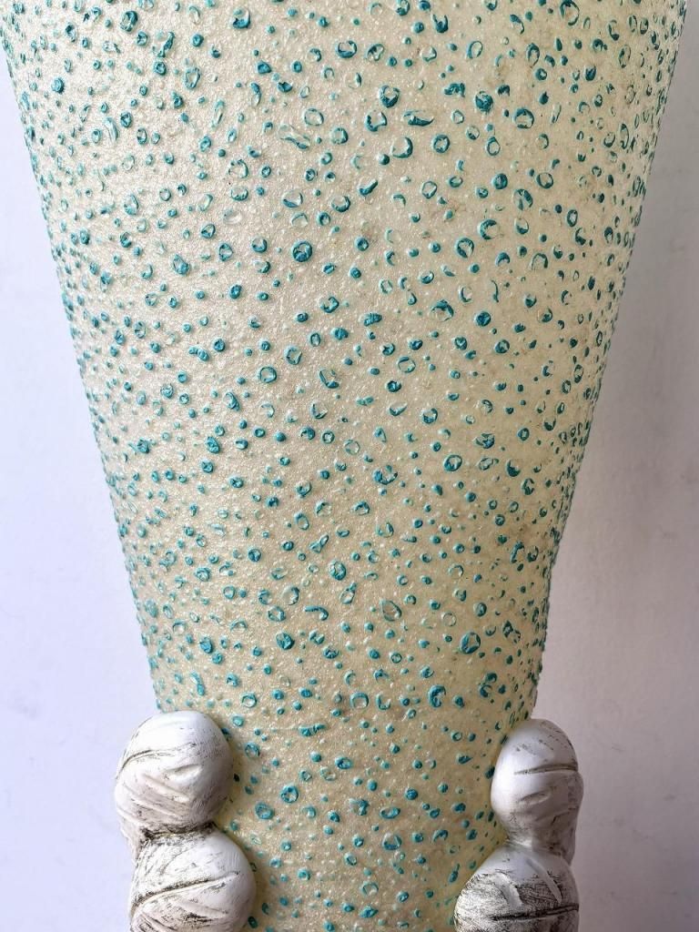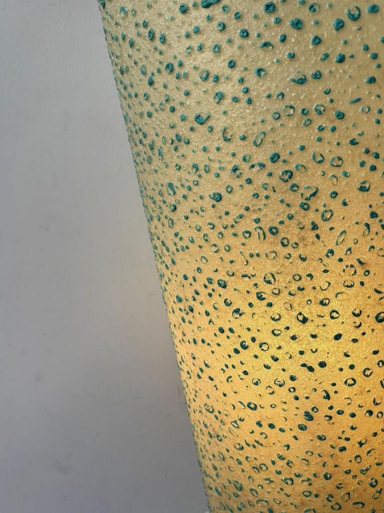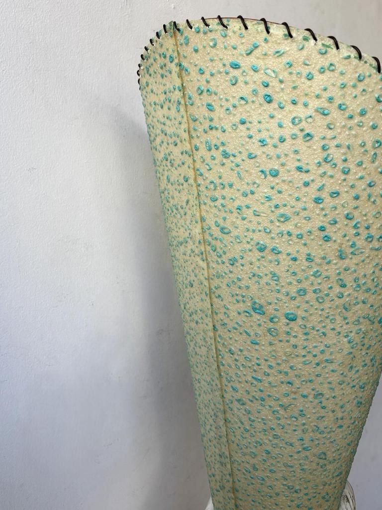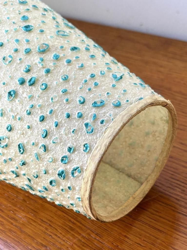 シェードにデザインされた、凹凸のある水色のドットはその時代らしいディテールで、点灯時にはあたたかく拡がる柔らかい拡散光となり、光の彫刻のような存在感となります。