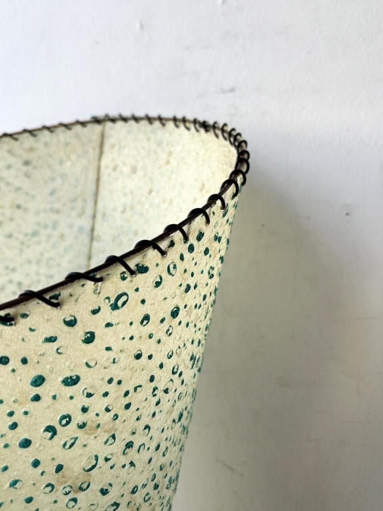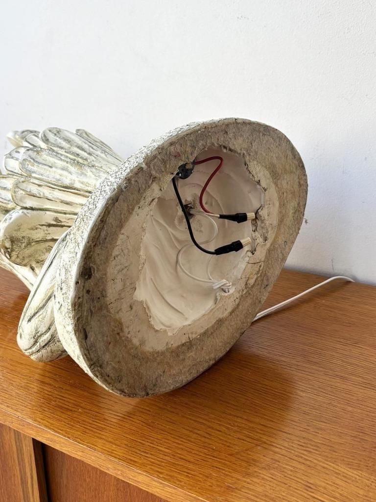 プラスター特有の柔らかく彫り込まれた立体感があり、植物の芽吹きや羽根、水の流れなどを思わせる自然物の抽象表現に適した素材で、ミッドセンチュリー期を代表するファイバーシェードを贅沢に組み合わせ、デザインとしての完成度が非常に高い一品。