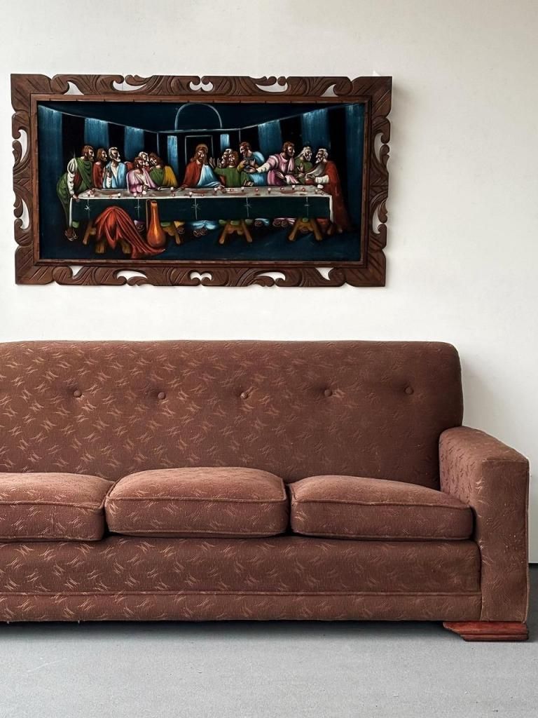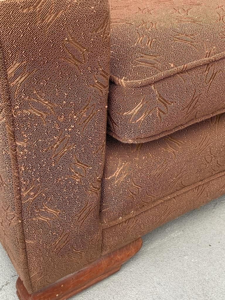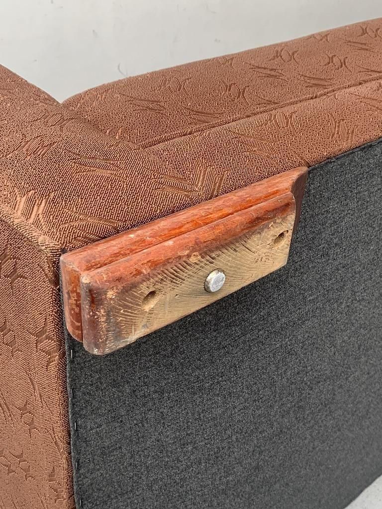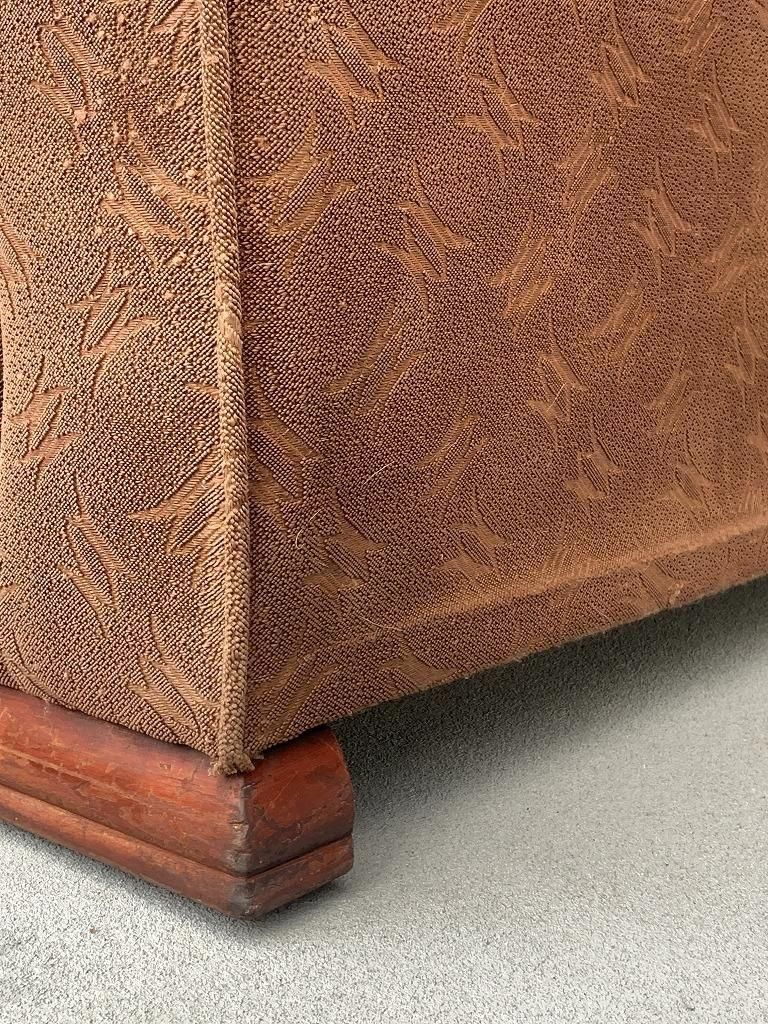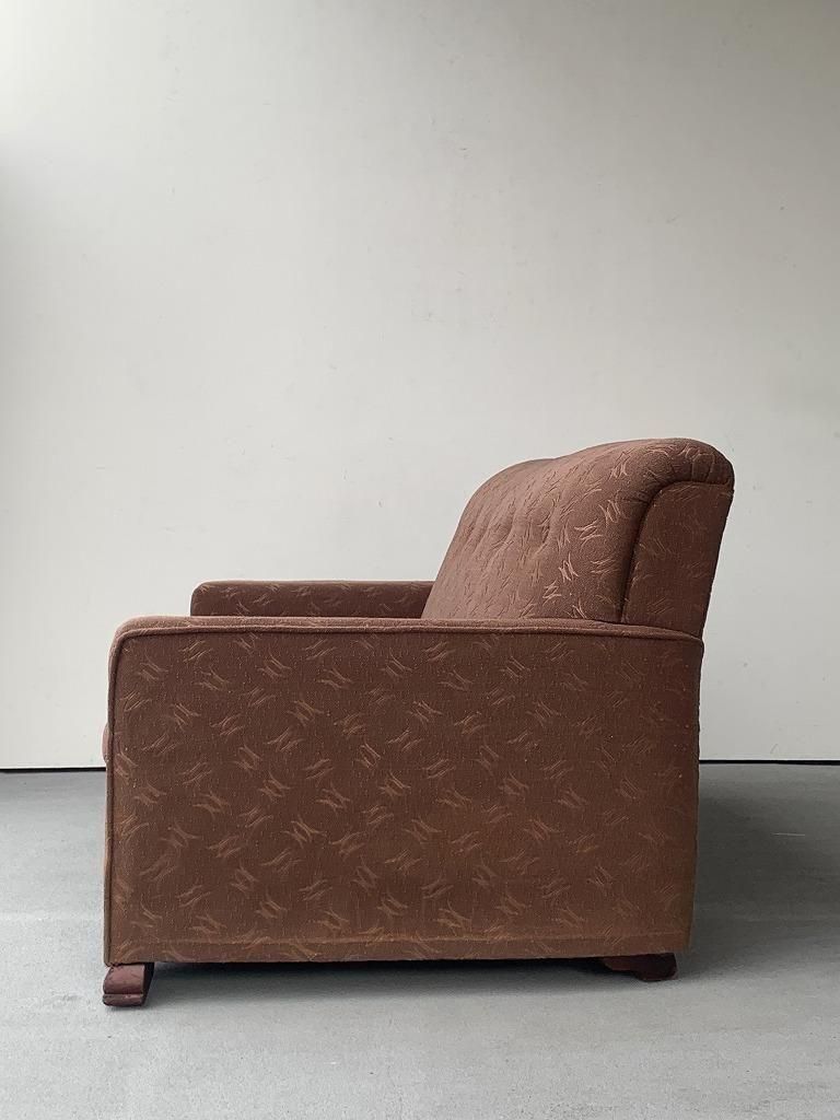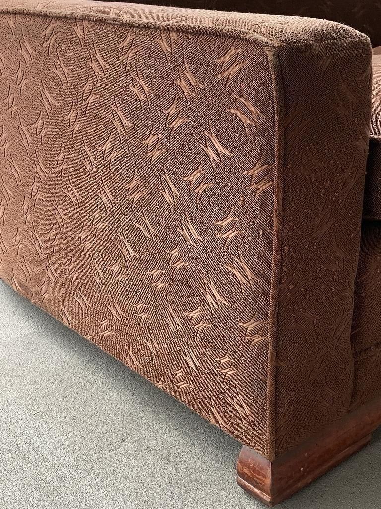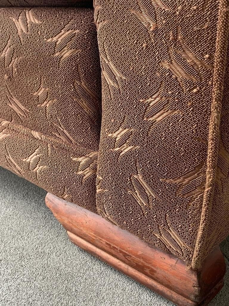 低く太めのウッドベースで本体を支える構造は、1940年代〜戦後直後ソファの典型的特徴で、古いホテルファニチャーの空気感が漂います。