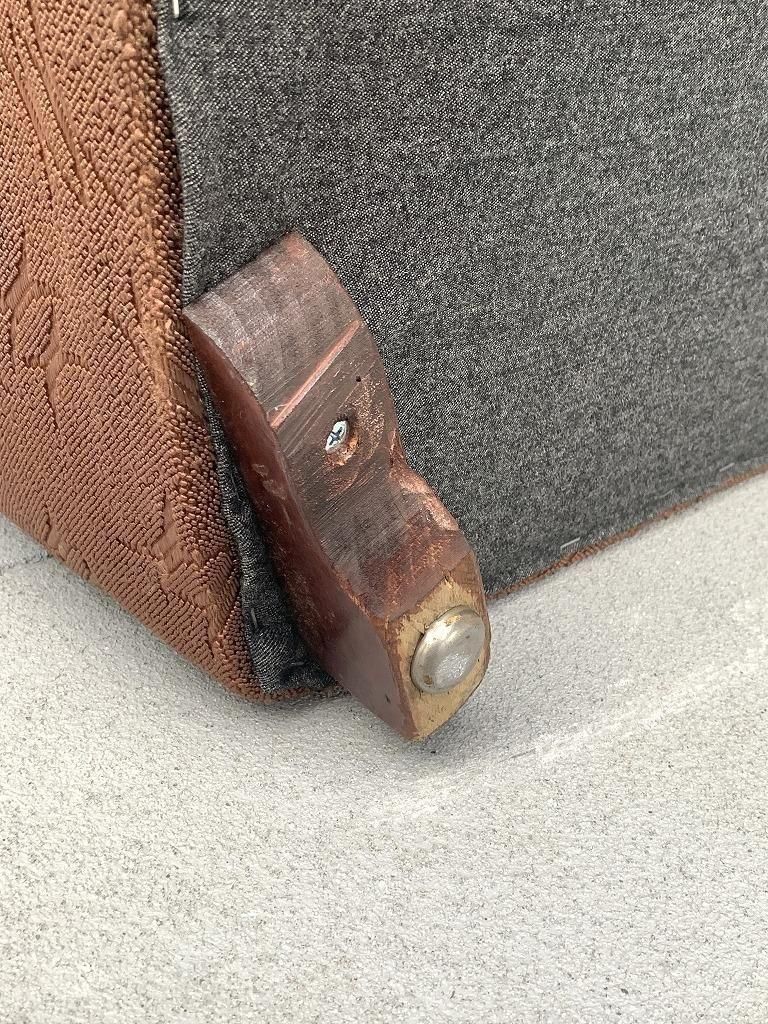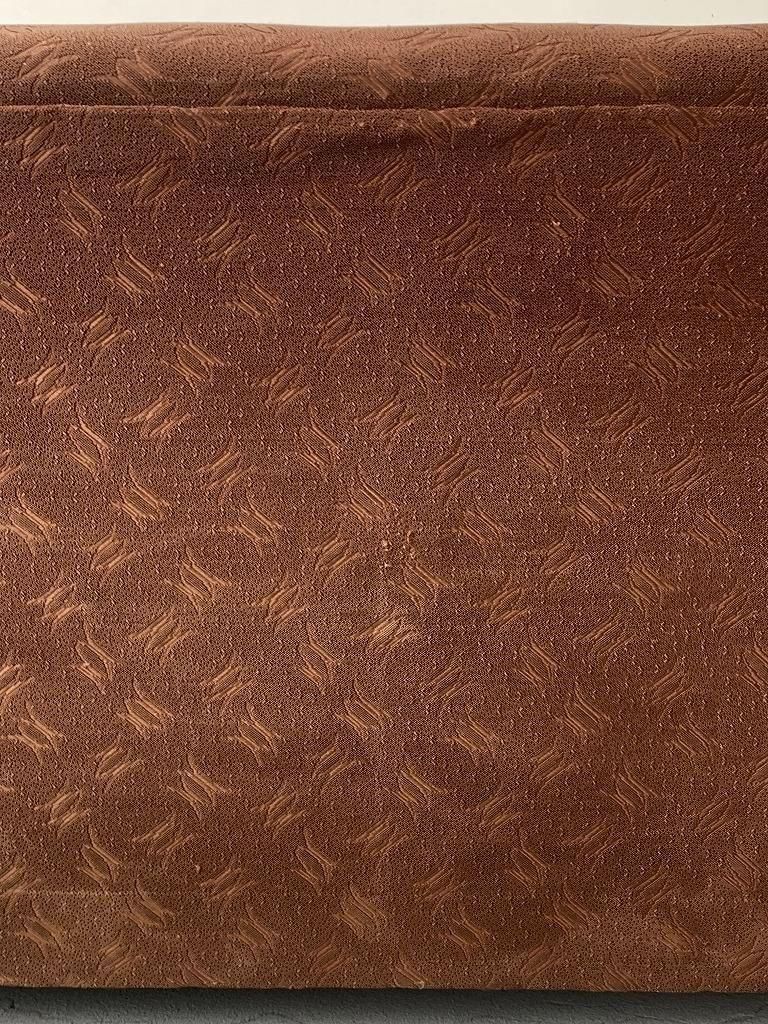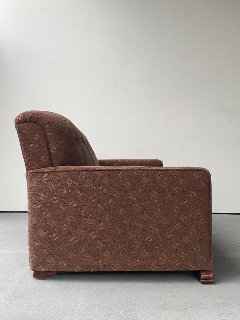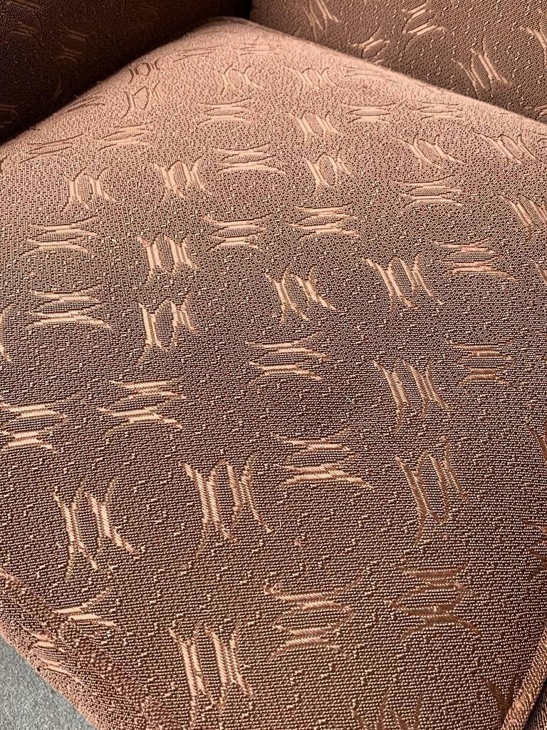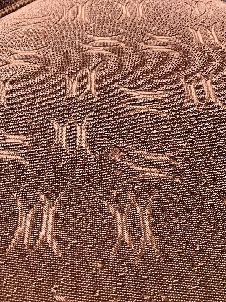 ファブリックは、当時の高級ソファでよく使われたジャカード織り。光沢のある糸で織り込まれた、抽象的な葉や幾何のパターンがデザインされ、戦後の華美すぎない装飾感と手仕事の温かみが魅力的です。