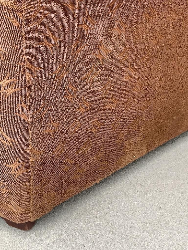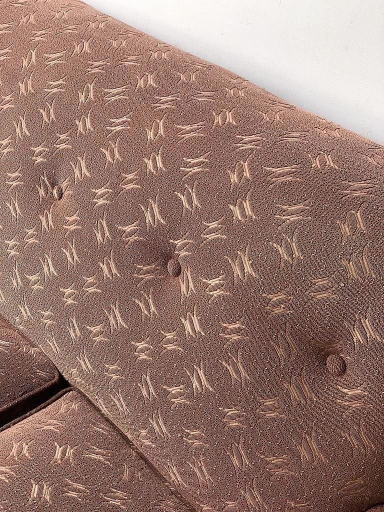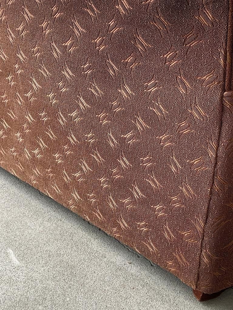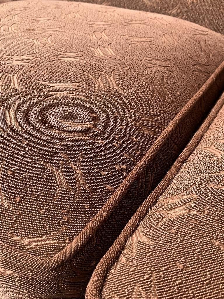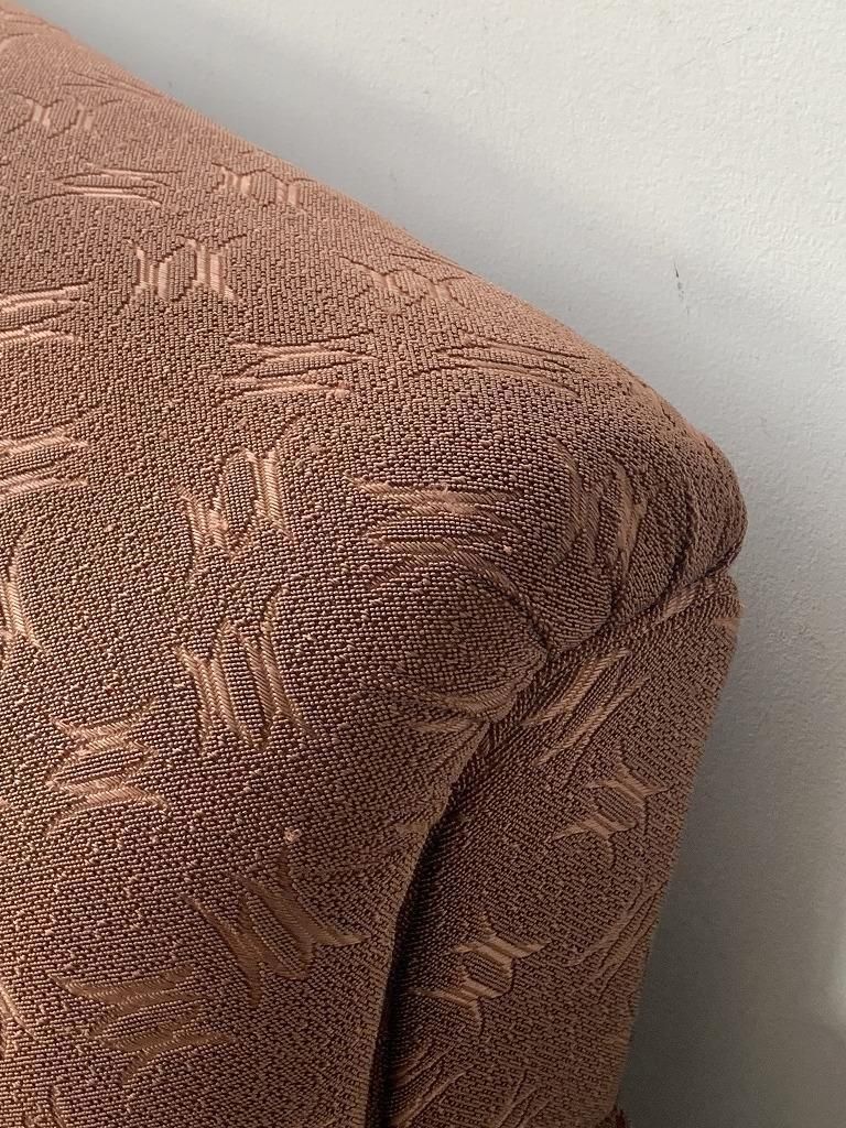 ファブリックは、当時の高級ソファでよく使われたジャカード織り。光沢のある糸で織り込まれた、抽象的な葉や幾何のパターンがデザインされ、戦後の華美すぎない装飾感と手仕事の温かみが魅力的です。