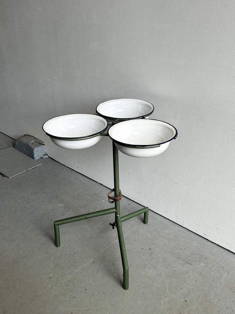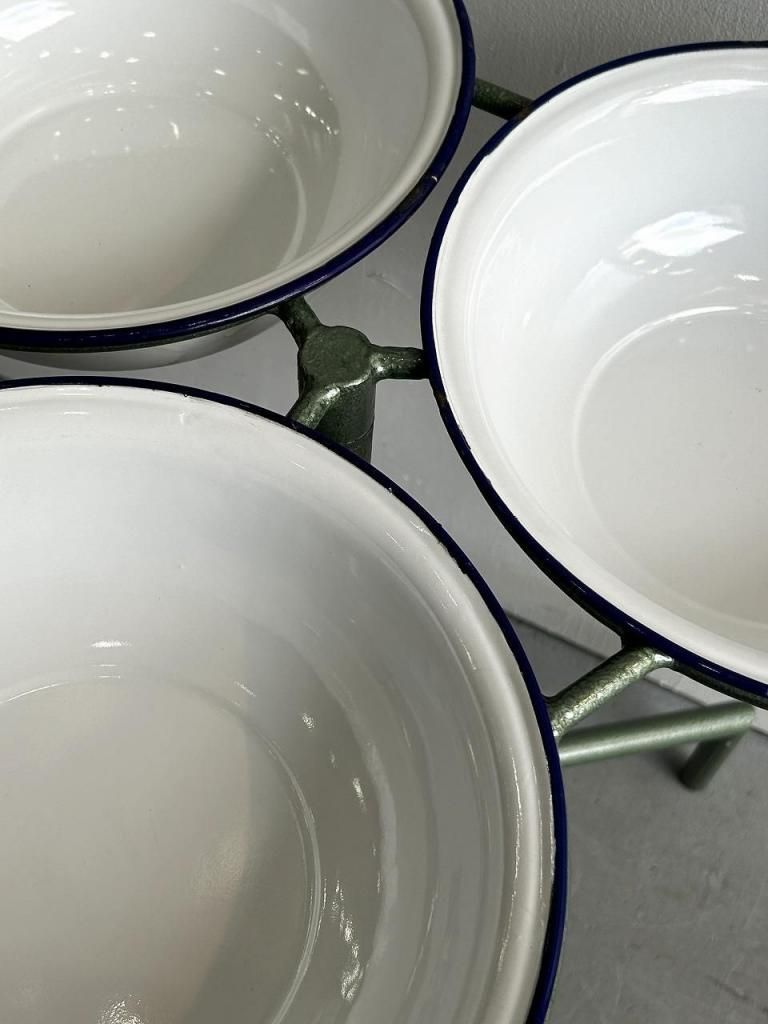 アイアン製のフレームにホワイトのホーローボウルが3つ乗せられた一台。