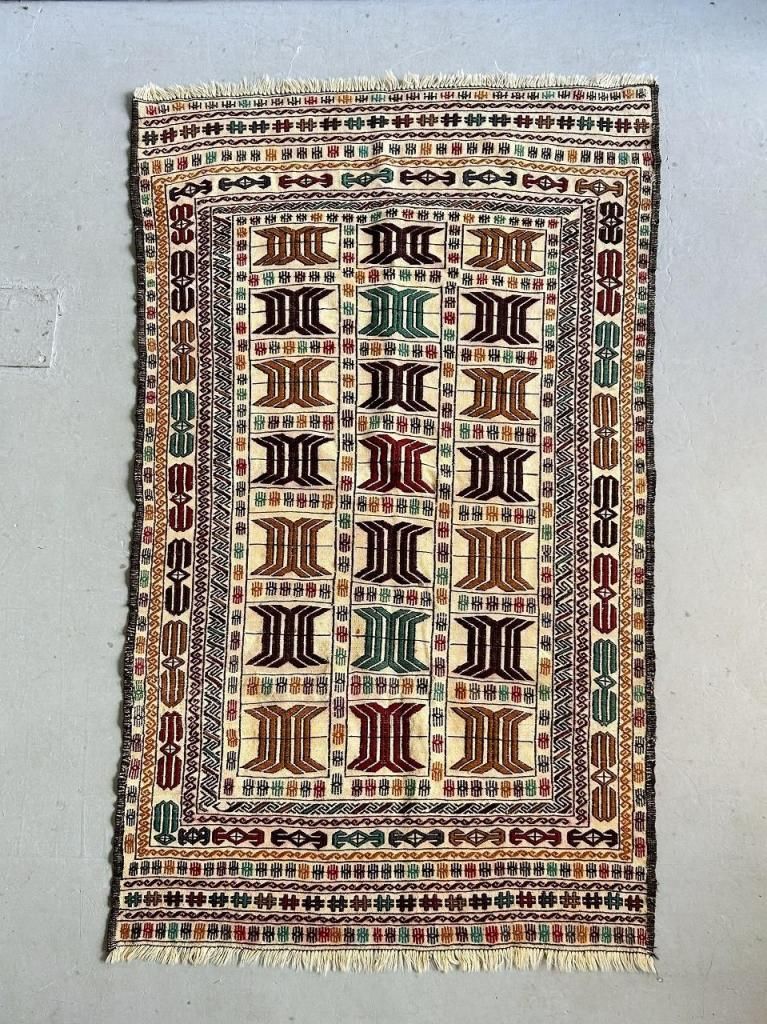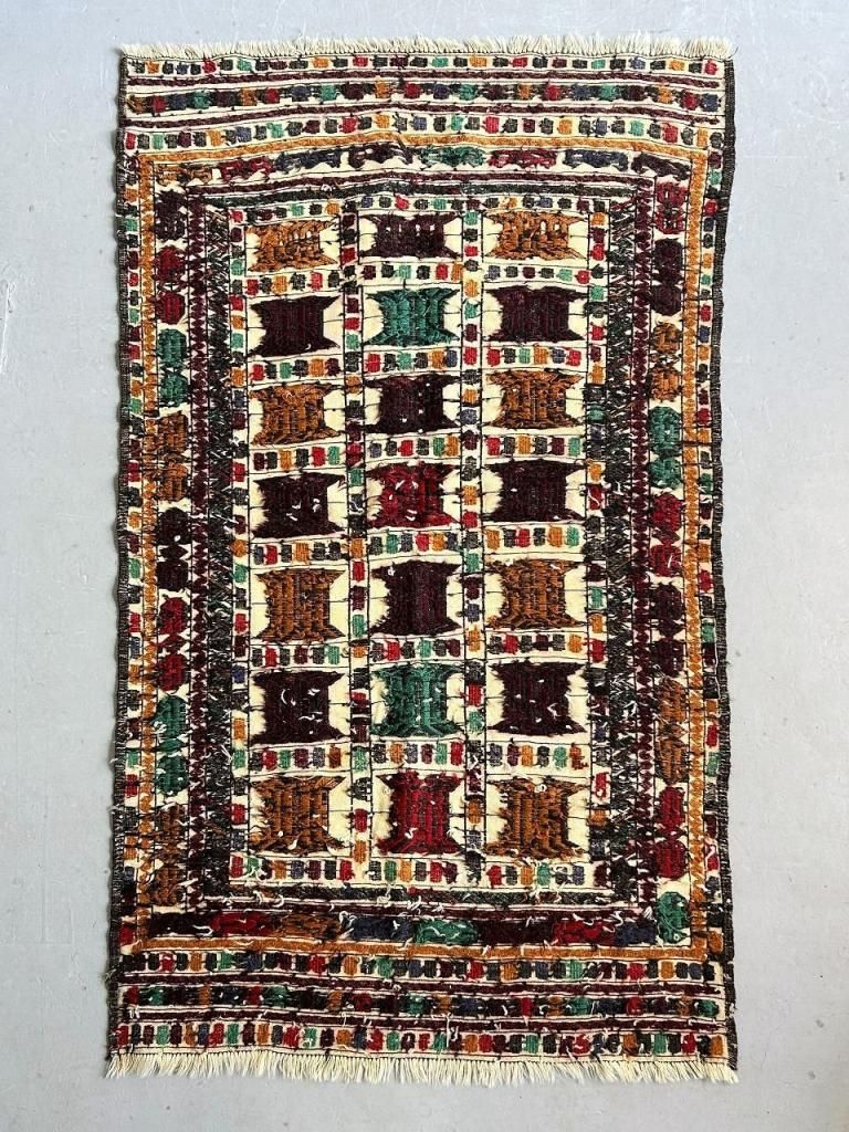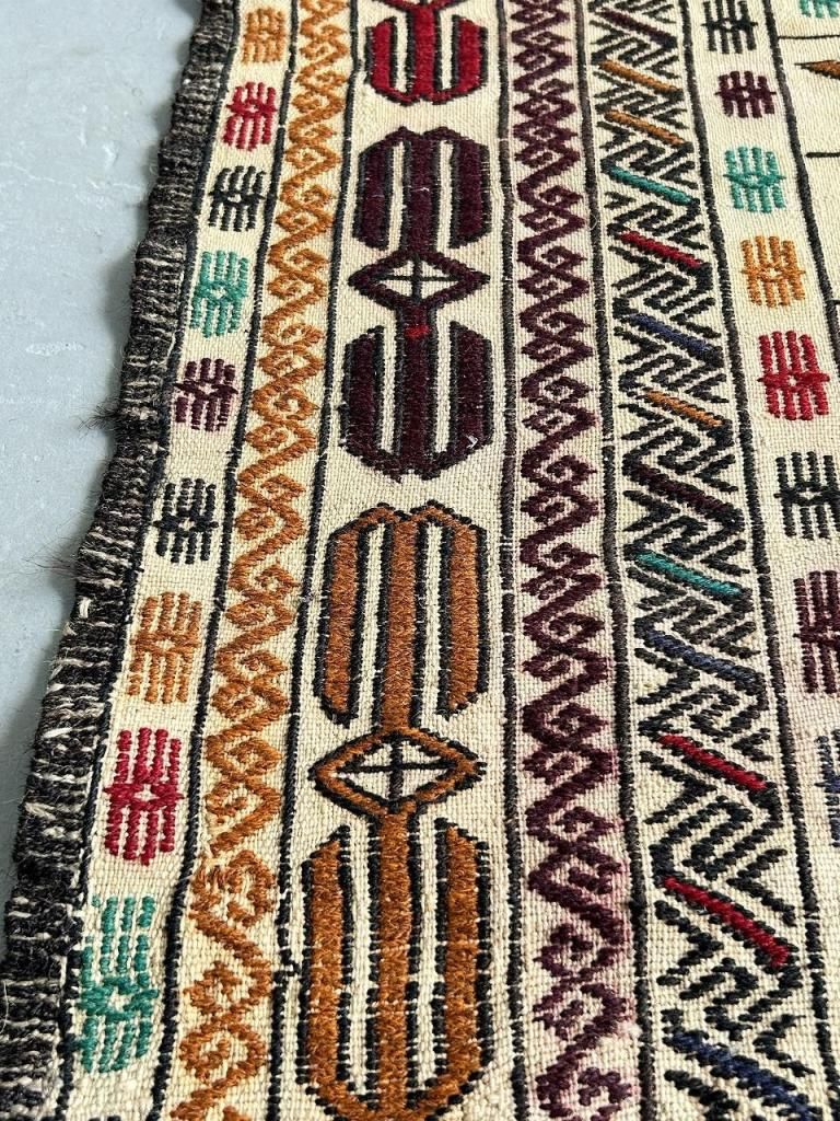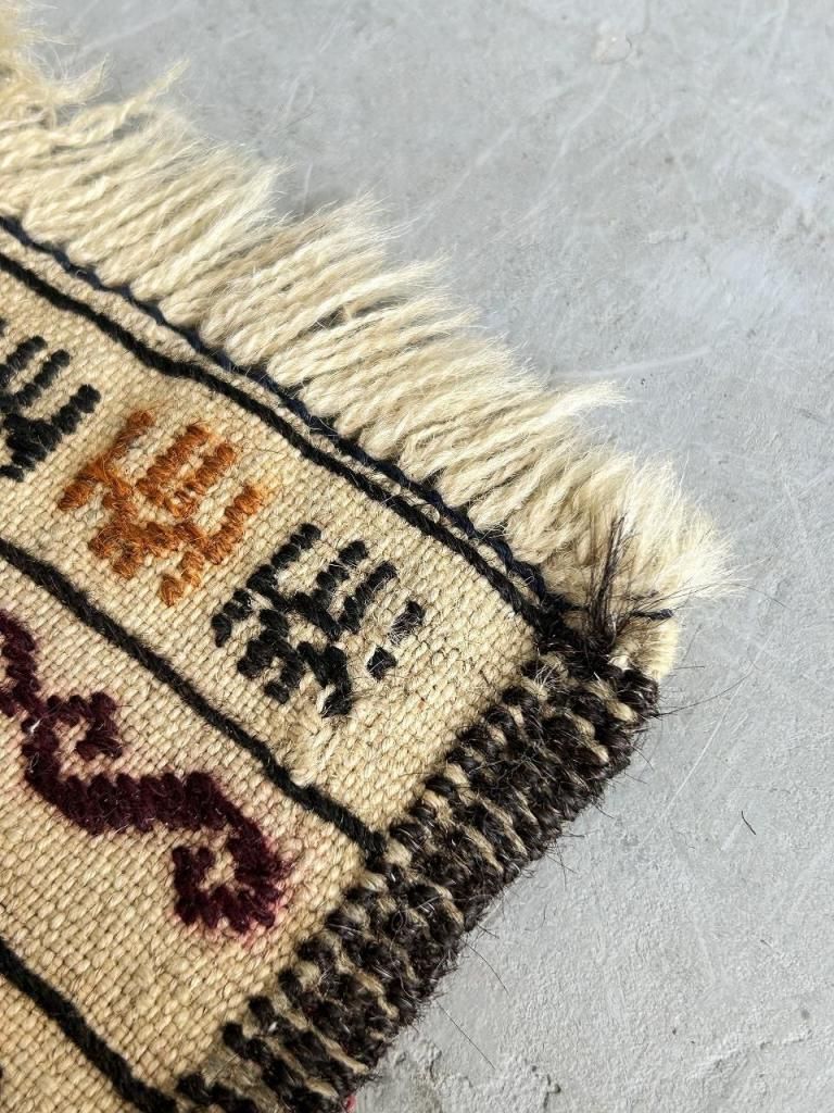 中央には門や柱のようにも見える象徴的なモチーフが規則的に並び、周囲には細やかな格子状パターンや装飾的なバンド文様が重層的にフレーミングされています。これらはバルーチ系トライバルラグの意匠に通じるデザインで、部族ごとの象徴や加護を意味することが多く、手仕事ならではの力強い表現として魅力を放ちます。