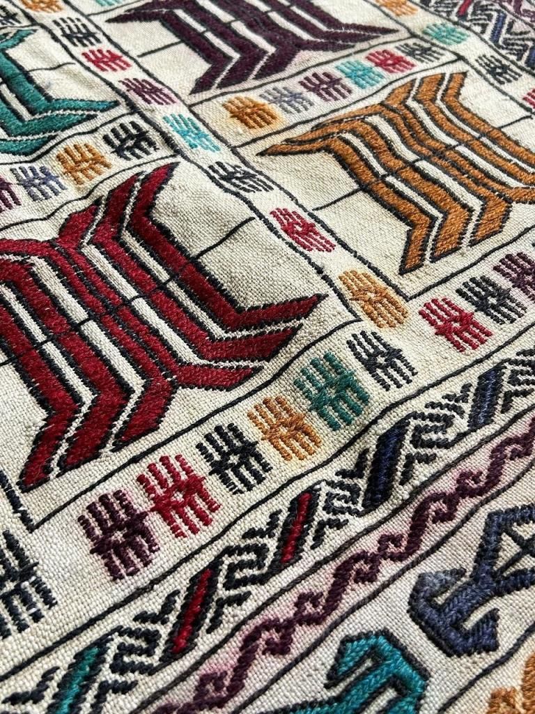 生成りのリネン地をベースに、深いブラウン、マスタード、グリーン、レッドなど多彩なウール糸を組み合わせ、リズミカルな幾何学文様をびっしりと織り込んだ美しい一枚。