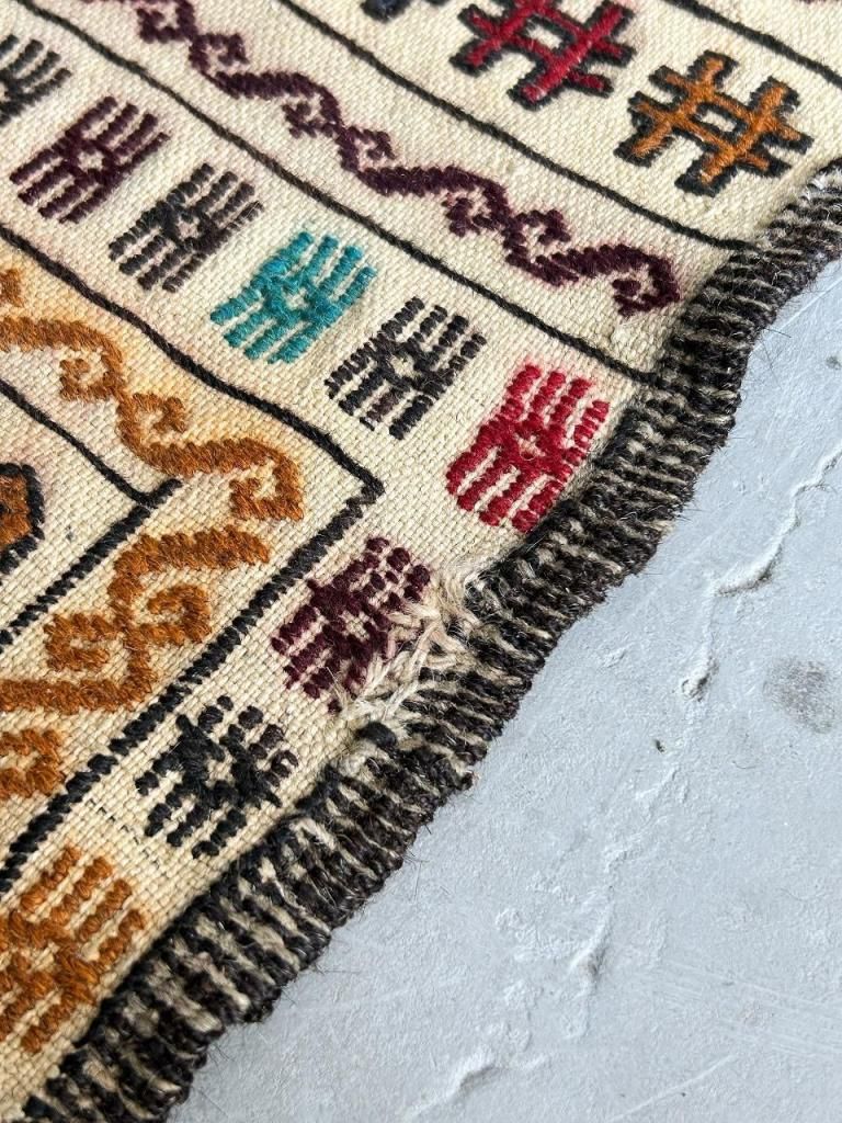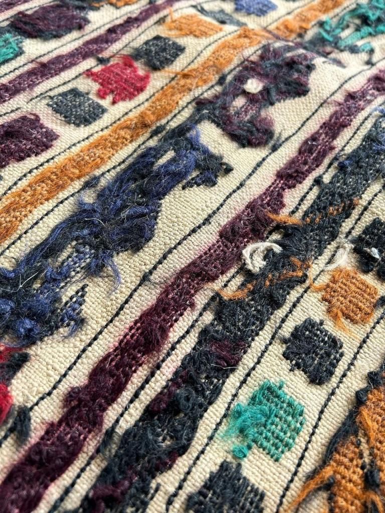端にはフリンジを残した素朴なエッジがあり、経年によるフェードやわずかな歪みも含めて、ハンドメイドラグ特有の味わいをしっかりと纏っています。
