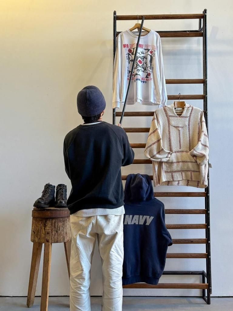 機能を最優先した造形で装飾をほぼ持たず、結果としてミニマルで現代的。ショップ什器として段棒にフックを掛けるだけで優秀なディスプレイラックとなります。