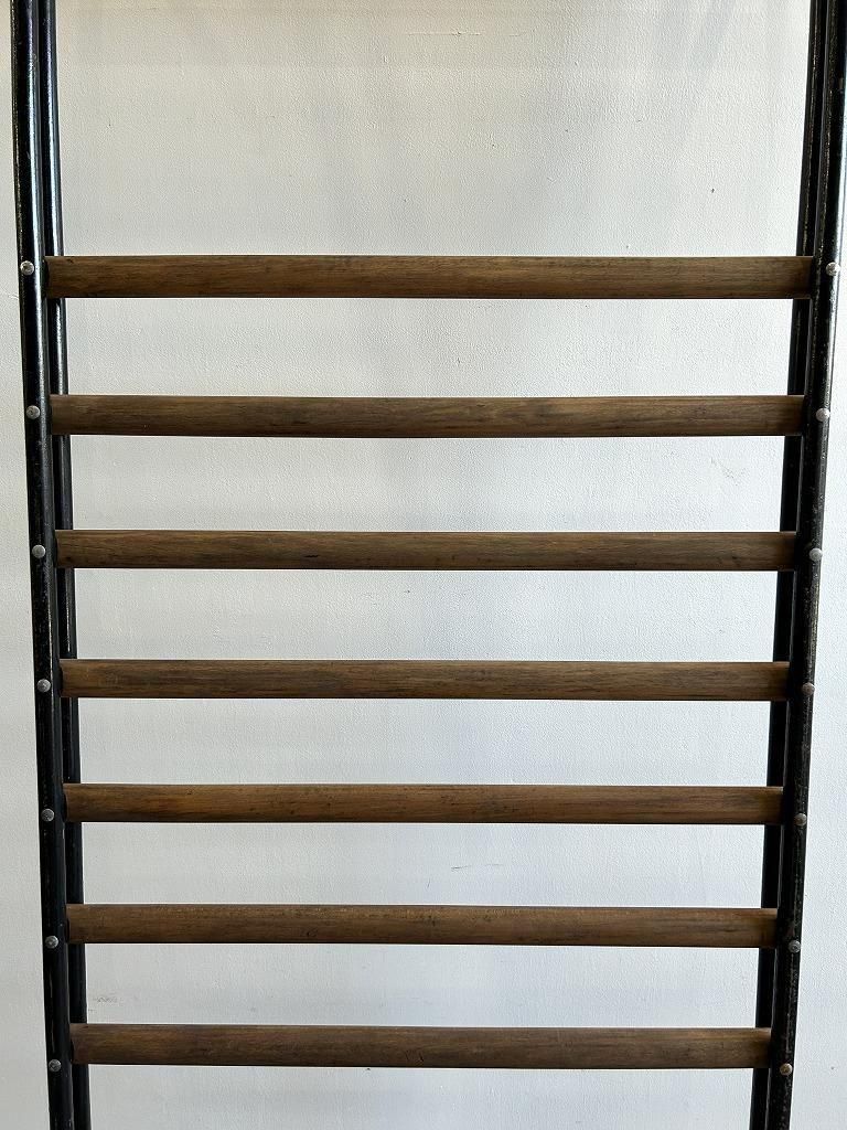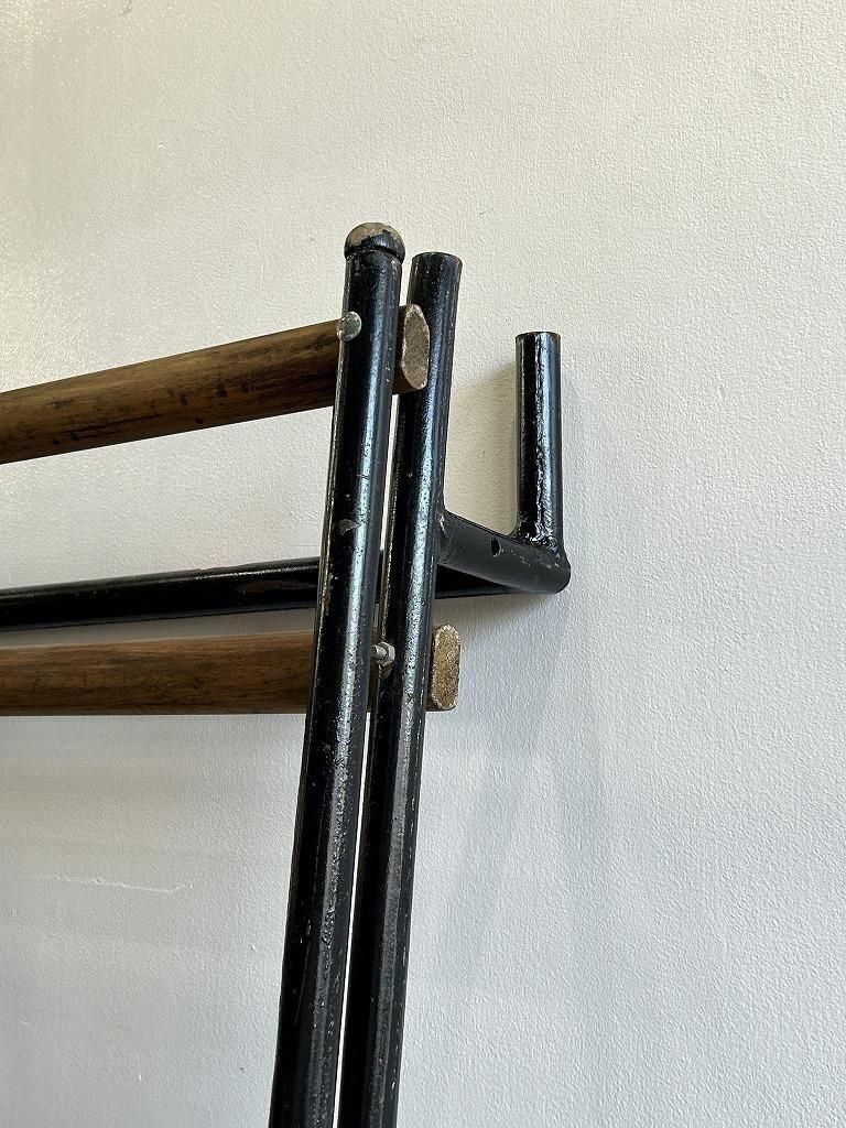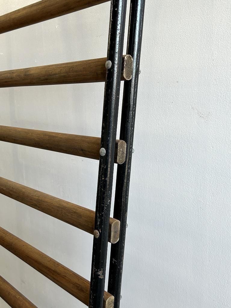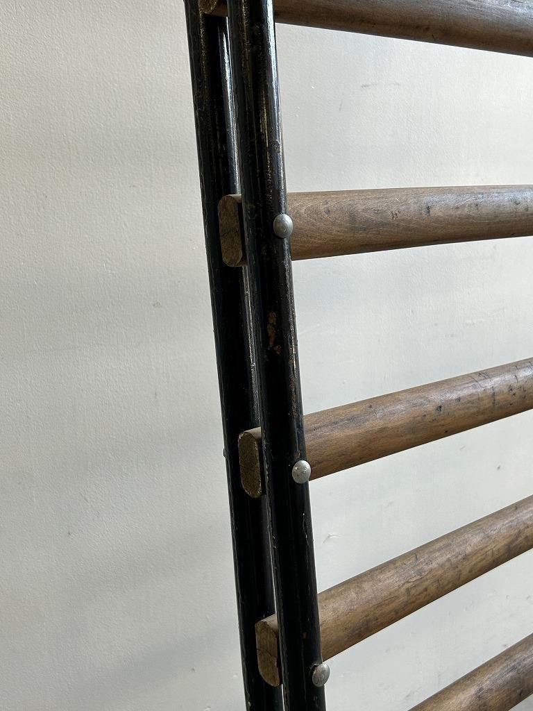 金属フレーム×無垢木材の段棒で、当時の体育用家具らしい頑丈で合理的な構造。表面仕上げは現代のような光沢塗装ではなく、半艶からマットの黒鉄をそのまま使う素朴な工業美で、素朴なインダストリアル感が漂います。