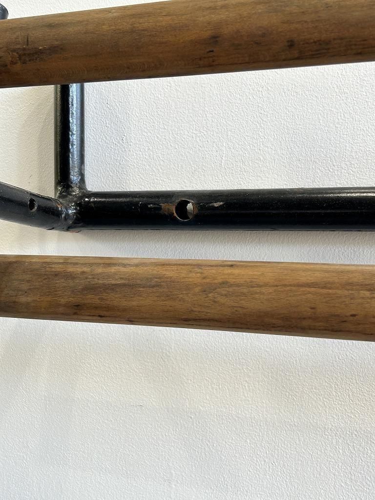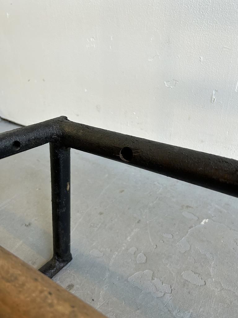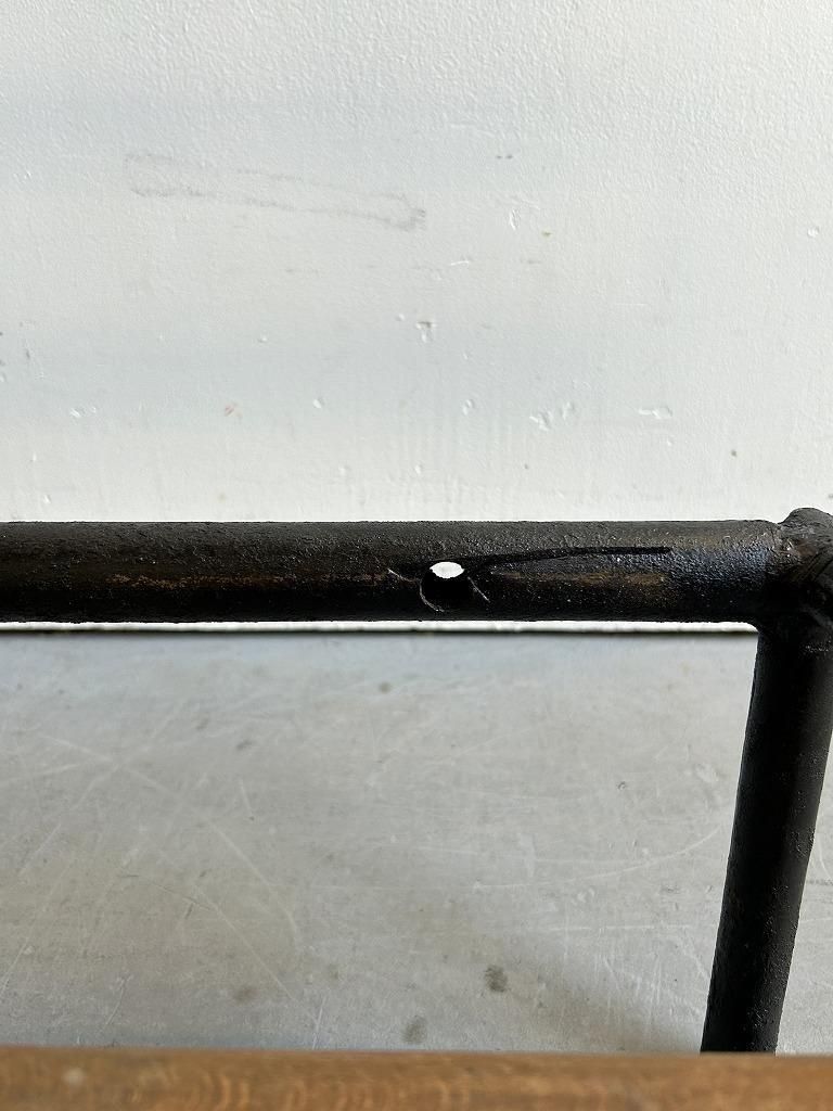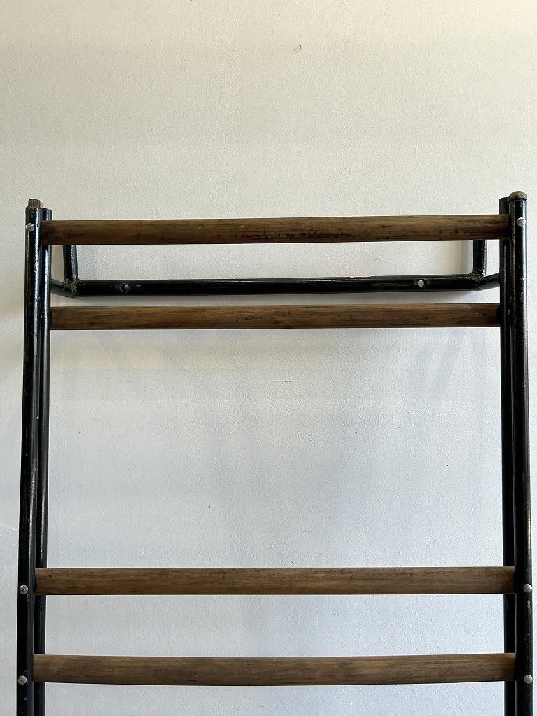 金属フレーム×無垢木材の段棒で、当時の体育用家具らしい頑丈で合理的な構造。表面仕上げは現代のような光沢塗装ではなく、半艶からマットの黒鉄をそのまま使う素朴な工業美で、素朴なインダストリアル感が漂います。