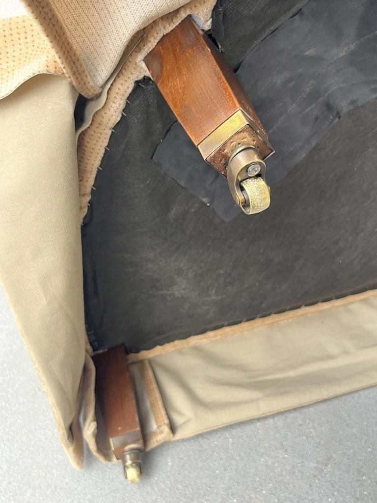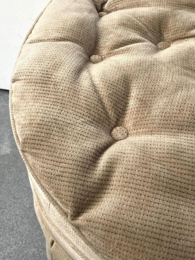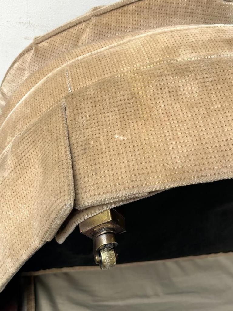 柔らかなベージュトーンのファブリックに、ふっくらとしたクッションと深いボタンタフティングが施された、当時らしいクラシカルな雰囲気の一台。