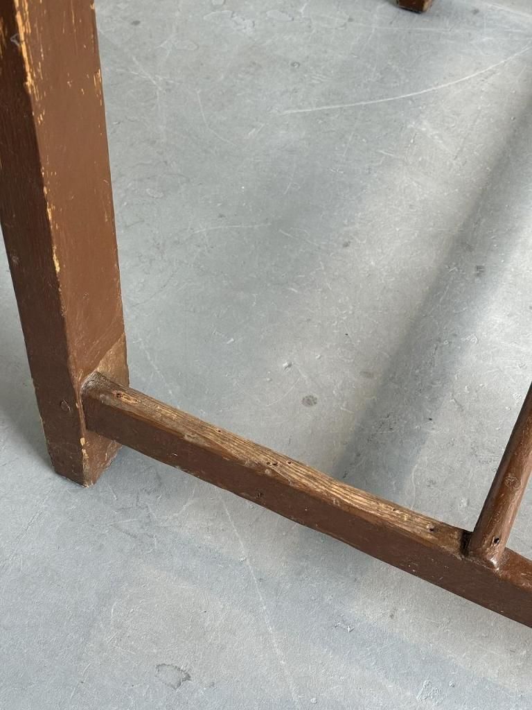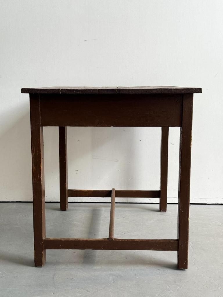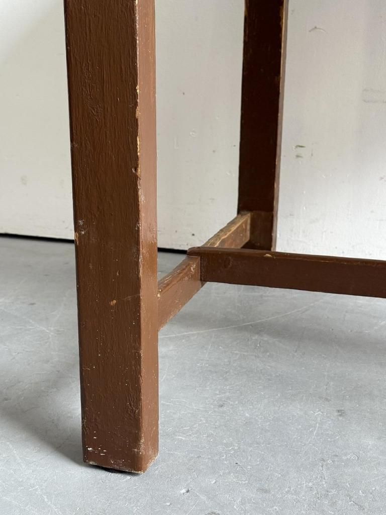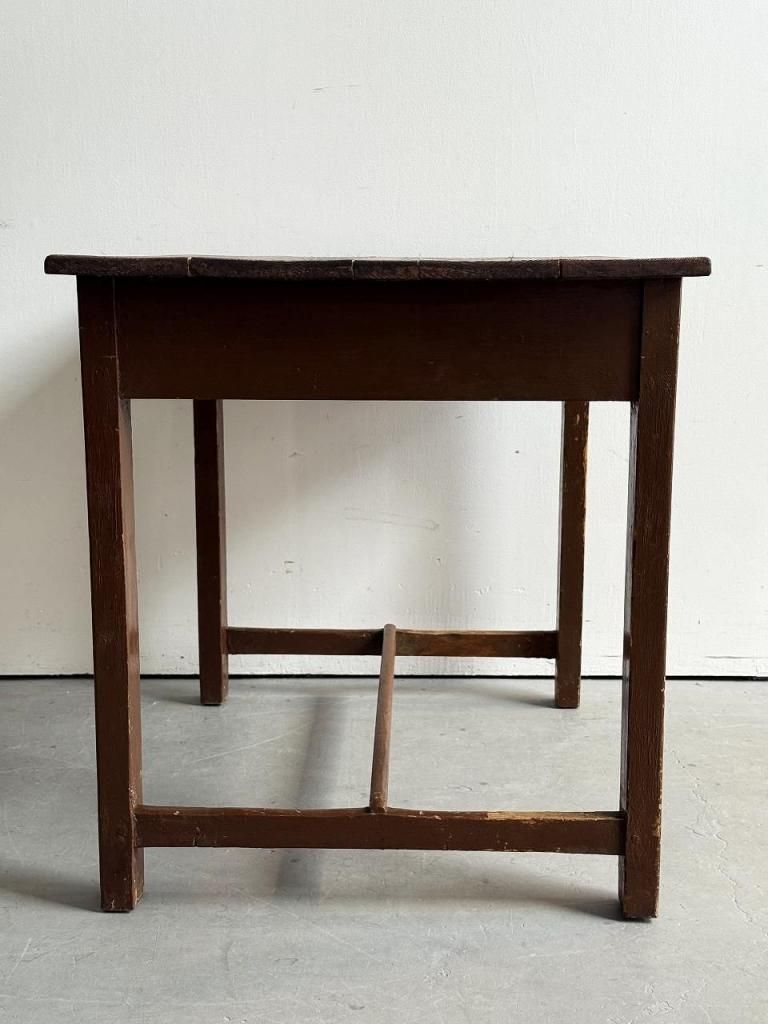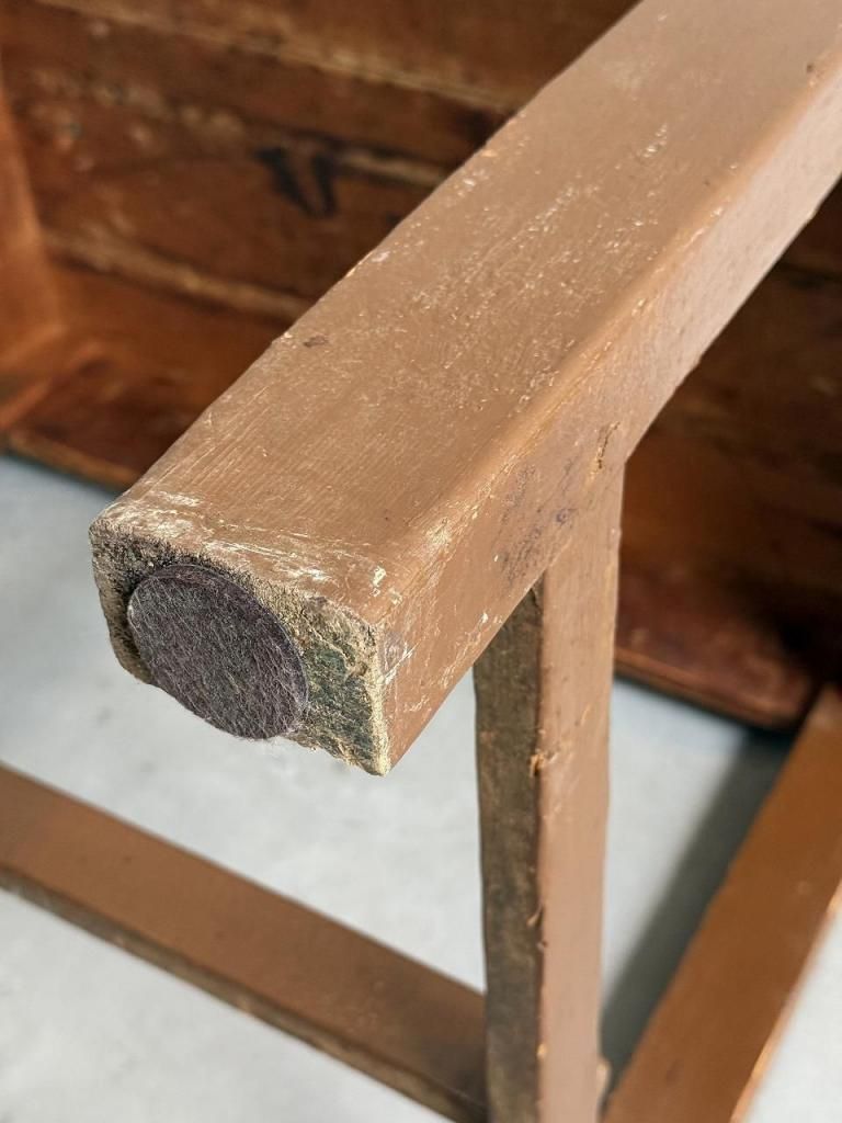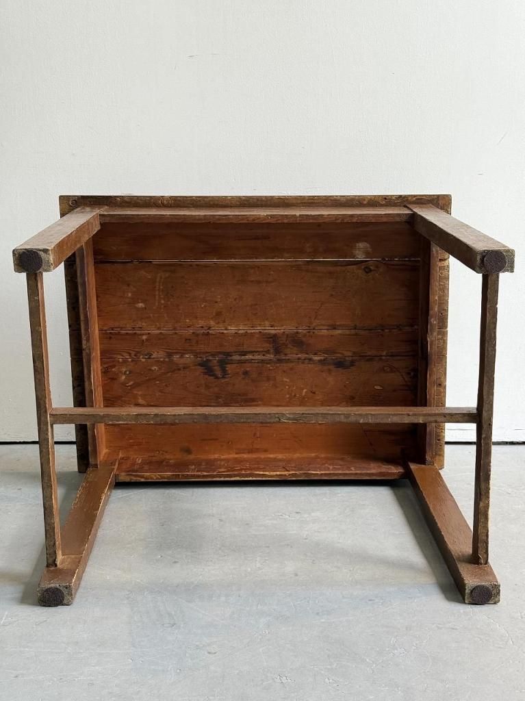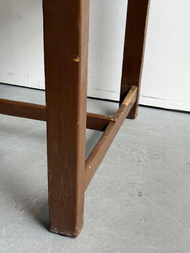 脚部は角材を用いた直線的なフレーム構造で、幕板と貫によってしっかりと剛性が確保されています。派手さはありませんが、日常的な作業や実務を支えてきた道具としての誠実さが伝わる佇まいです。