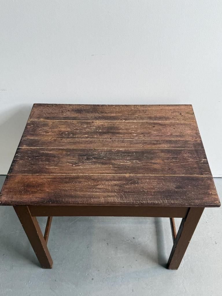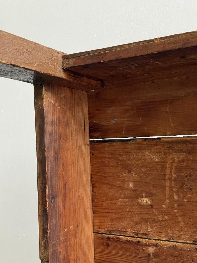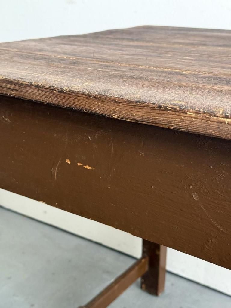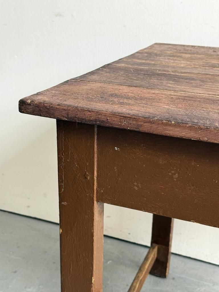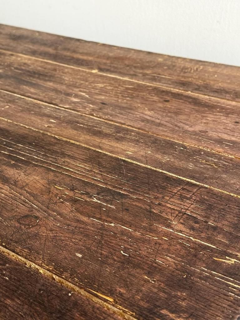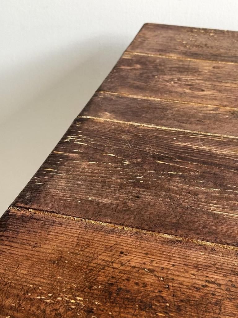 天板は無垢材の板を横方向に接ぎ合わせたシンプルなつくりです。表面には擦れや小傷、色ムラなどが随所に見られ、いわゆるシャビーな雰囲気を強く感じさせます。塗装が抜けた部分と濃く残る部分のコントラストも魅力です。