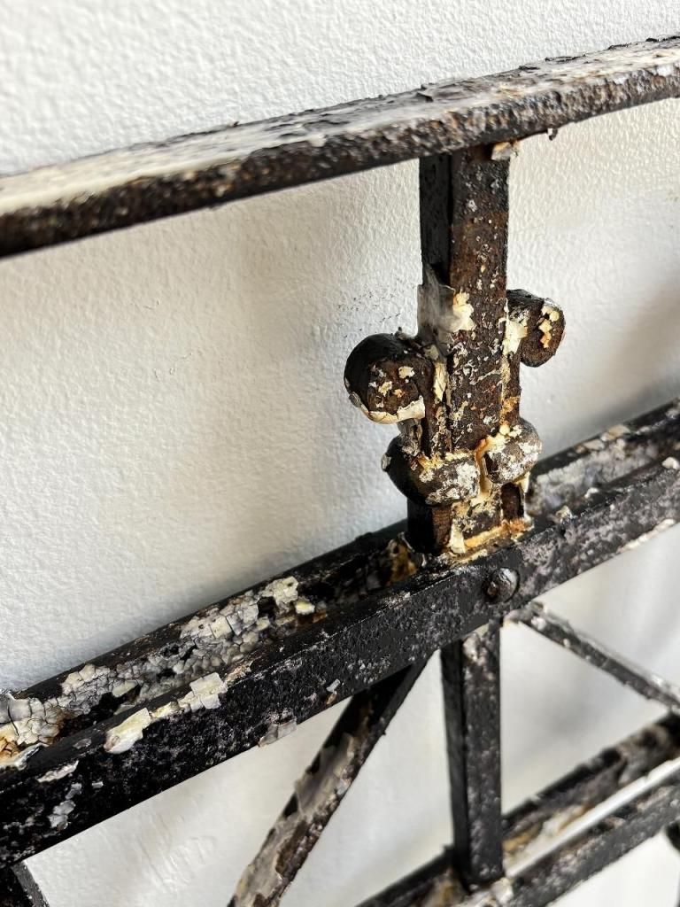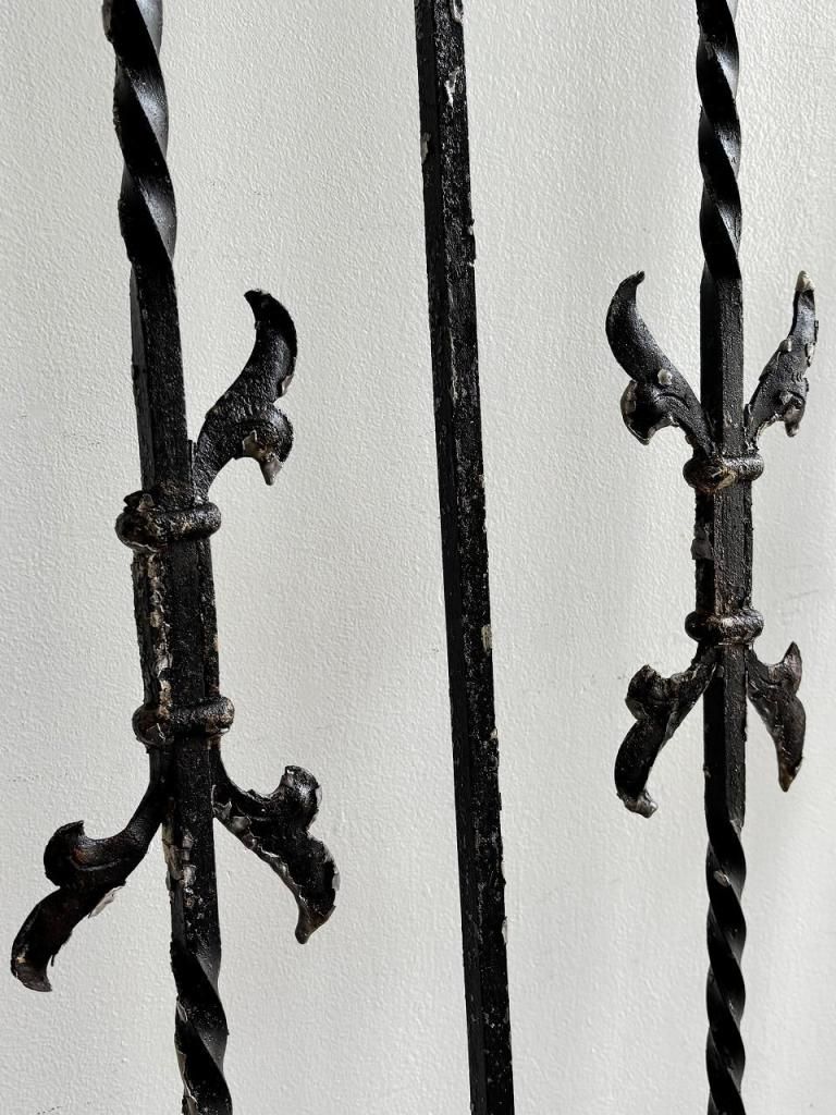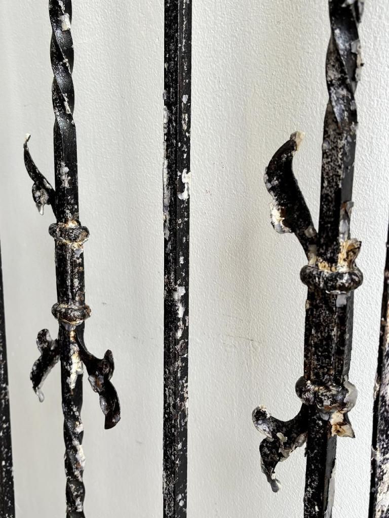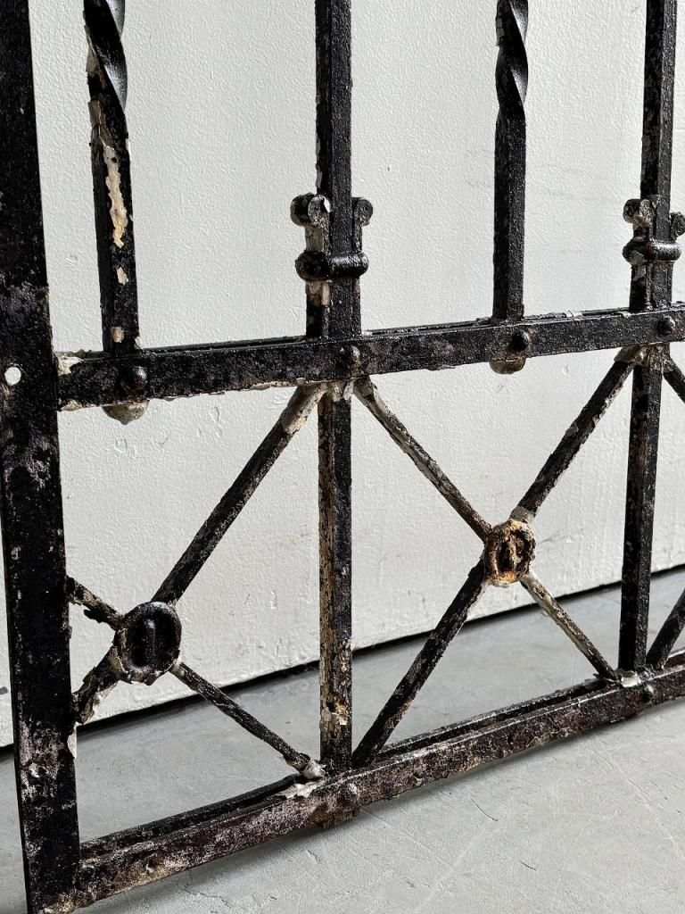 縦方向に配されたツイストアイアン、要所に施されたフルール・ド・リス(百合)を思わせるモチーフ、上下に走るX字の補強フレームなど、装飾と構造が同時に成立している点が大きな魅力です。