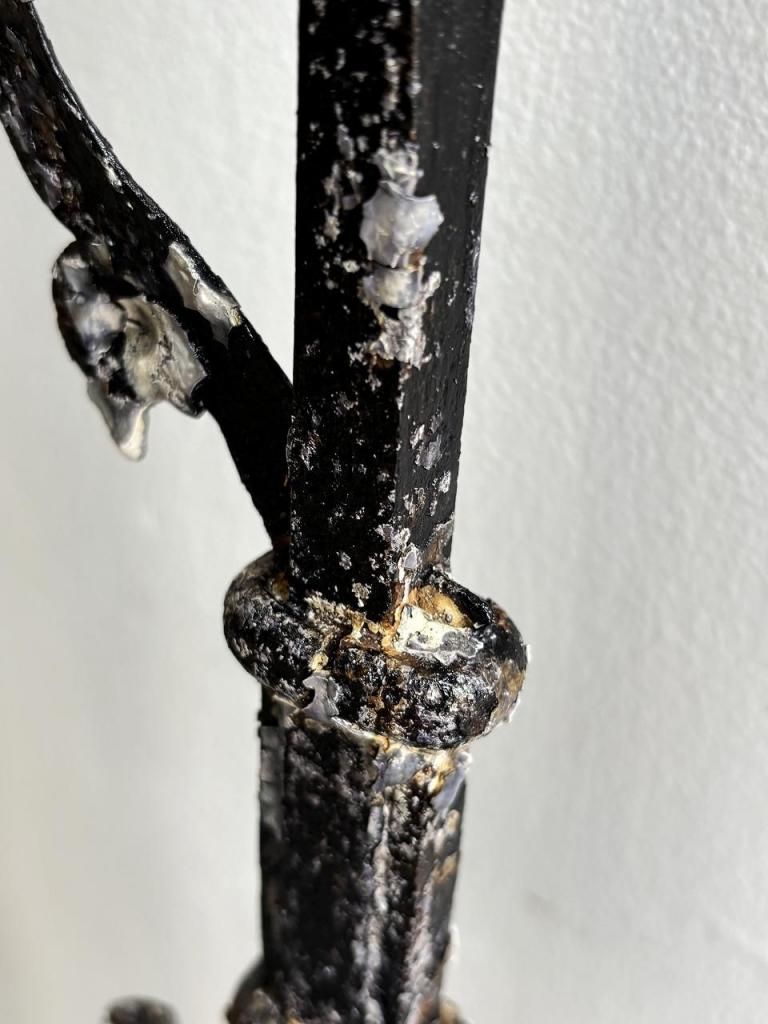 表面には、長年屋外で使用されてきたことで生まれたペイントの剥離、錆、凹凸が随所に残り、均一ではない黒の色味が奥行きのある表情を生んでいます。意図的に再現することのできない、時間を経た素材ならではの質感です。