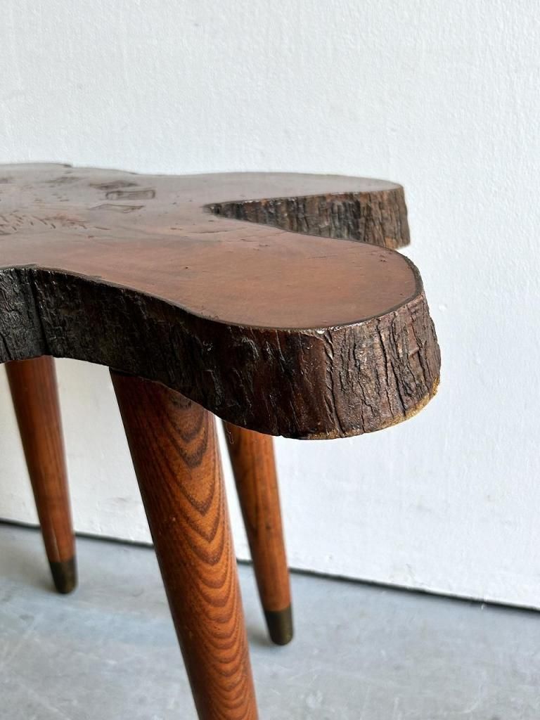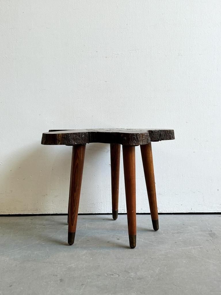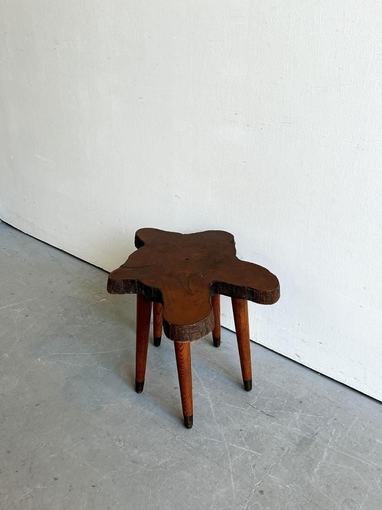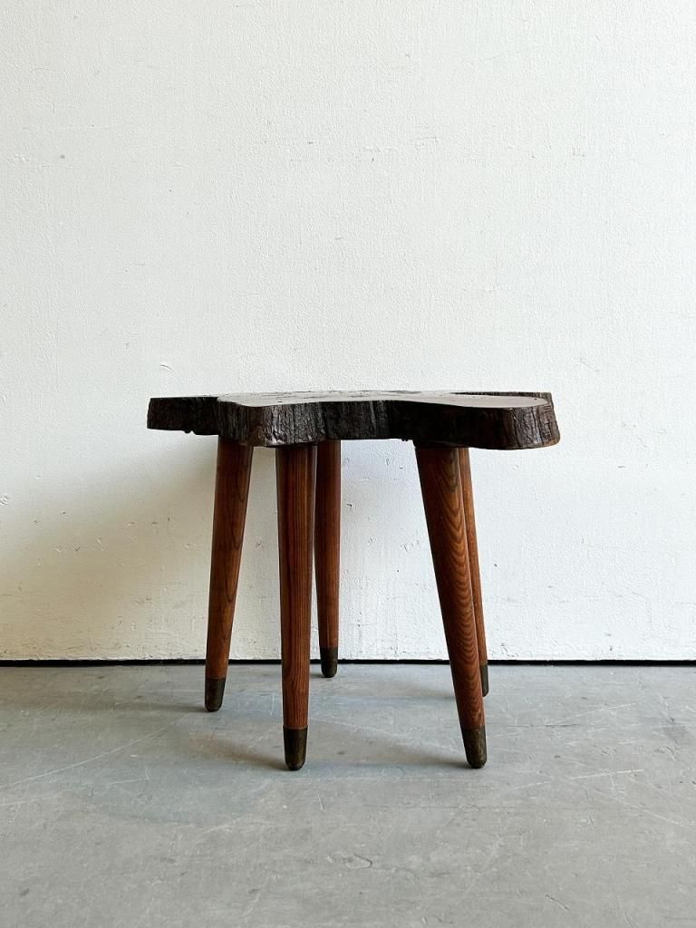自然な木の切り株や厚板をそのまま天板として用いた、非定形で有機的なフォルムが特徴の一点。