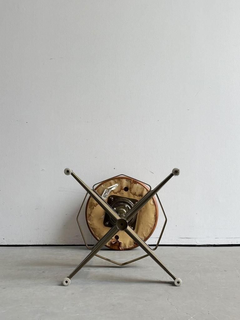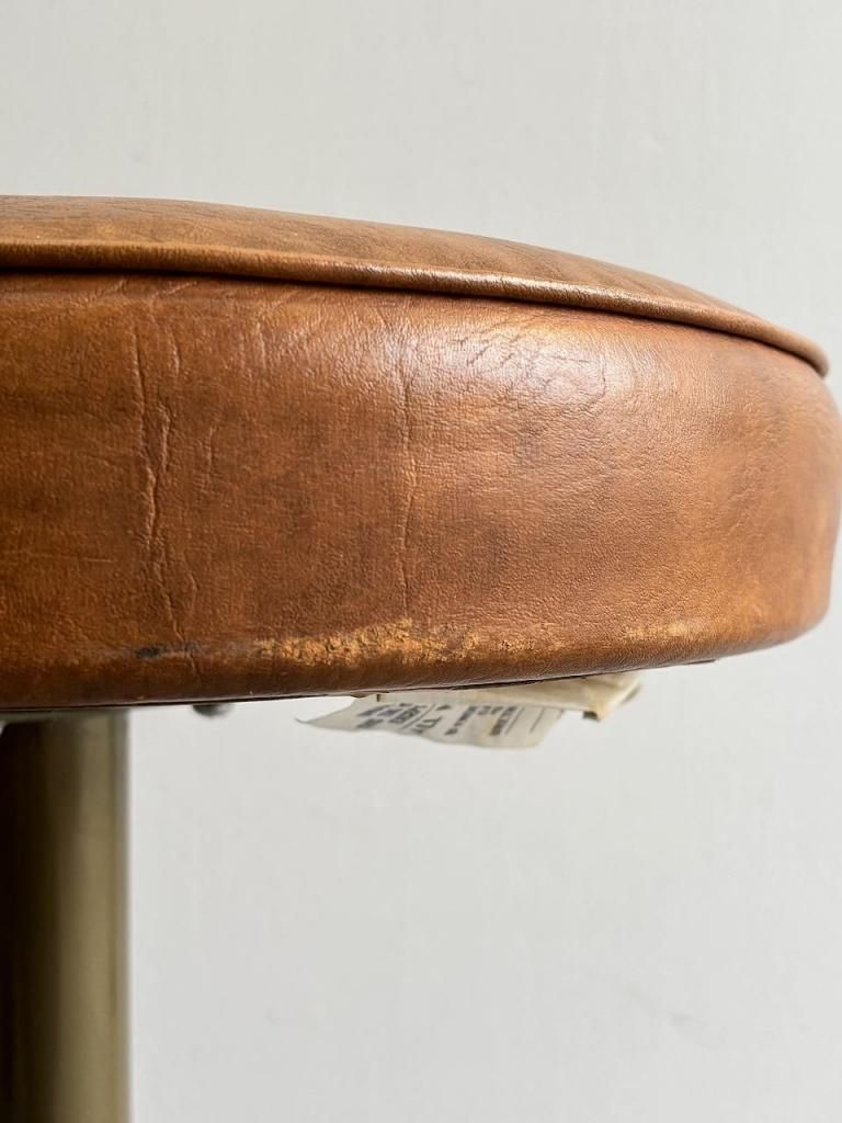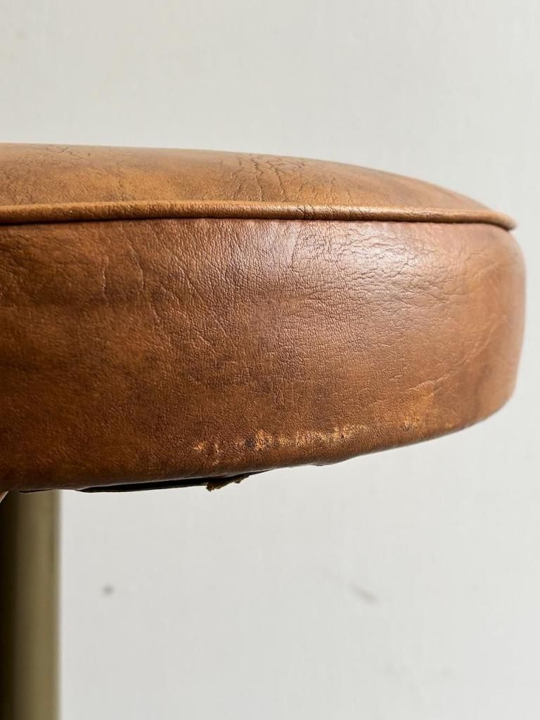 70年代らしいシンプルで完成度の高い円形座面×経年変化により出された表情のある艶のビニールレザーが合わさった一脚。