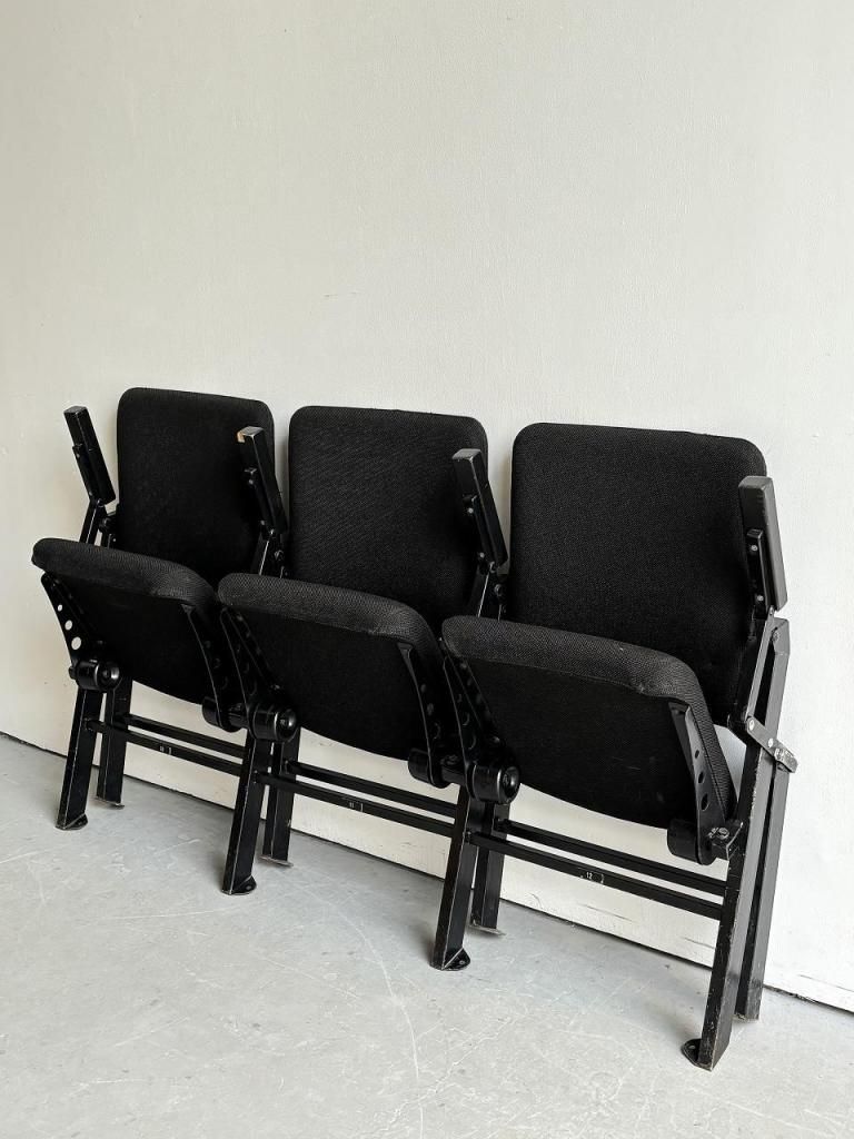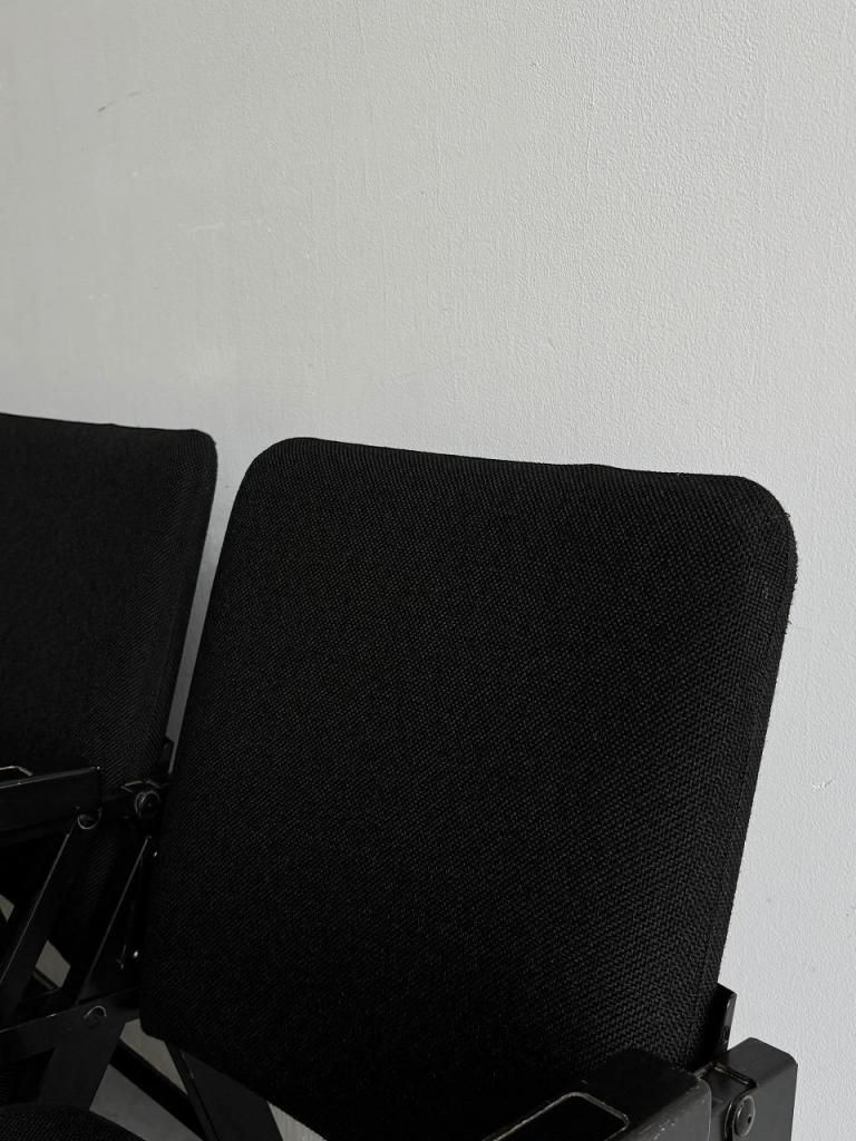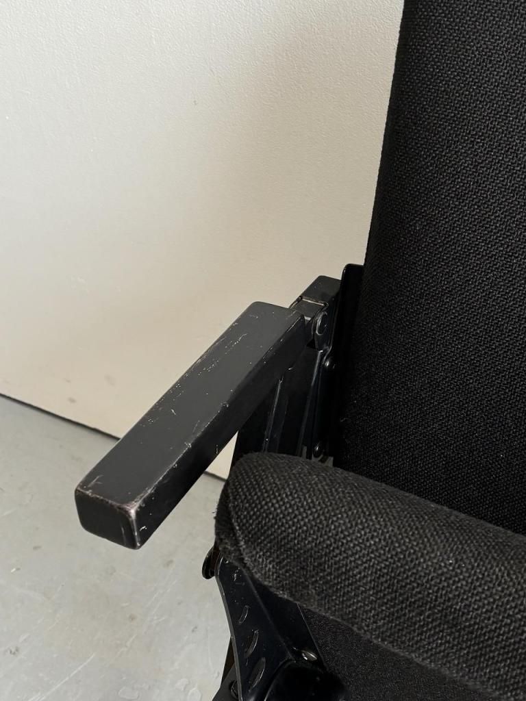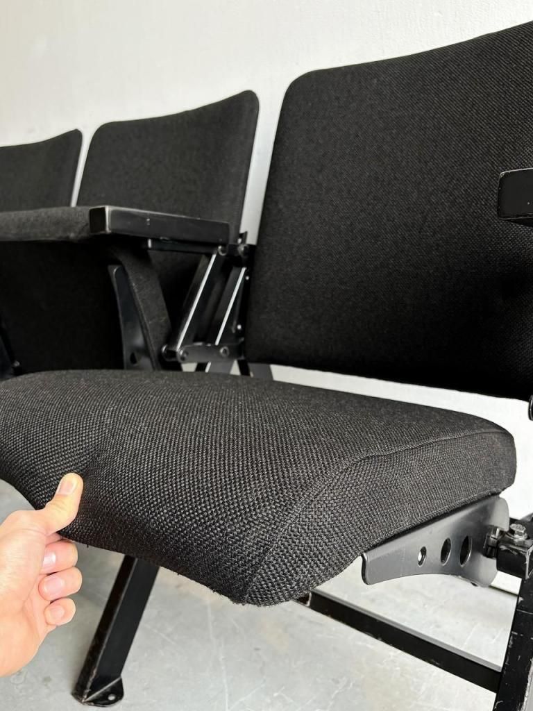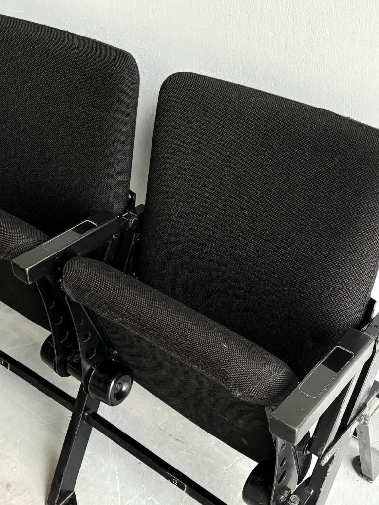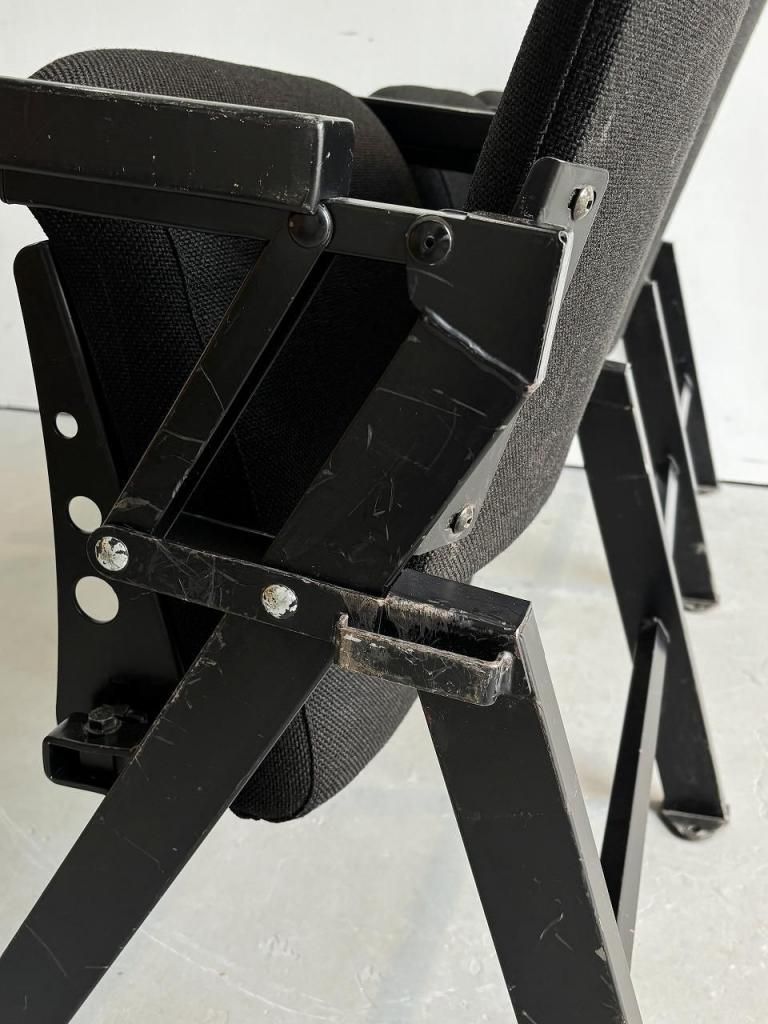 座面はアームが連結してフォールディング(跳ね上げ)できる構造で、通路幅を確保できる設計。劇場・講堂・スタジアムなど「人の流れ」を管理することを想定された、実用的な機能です。