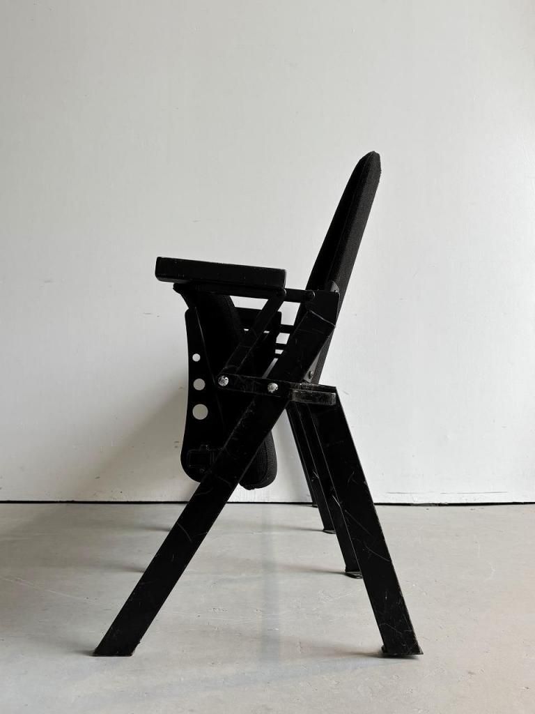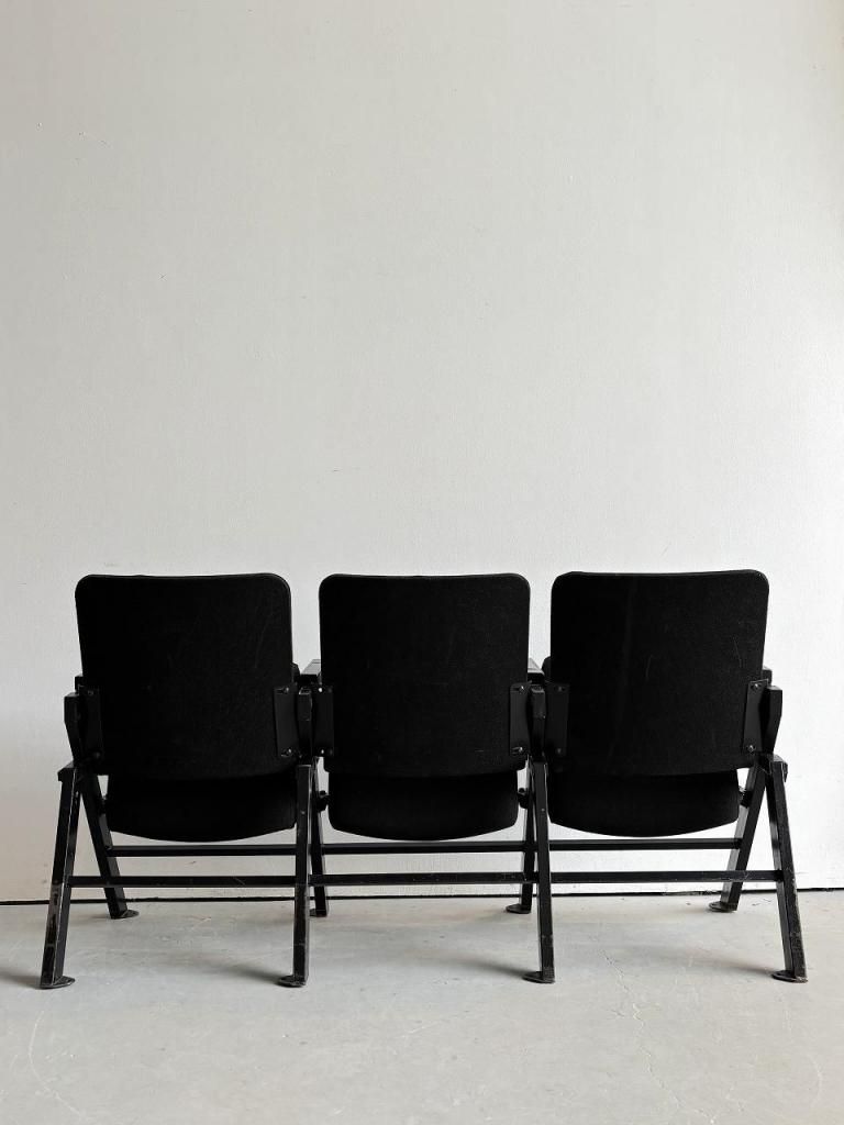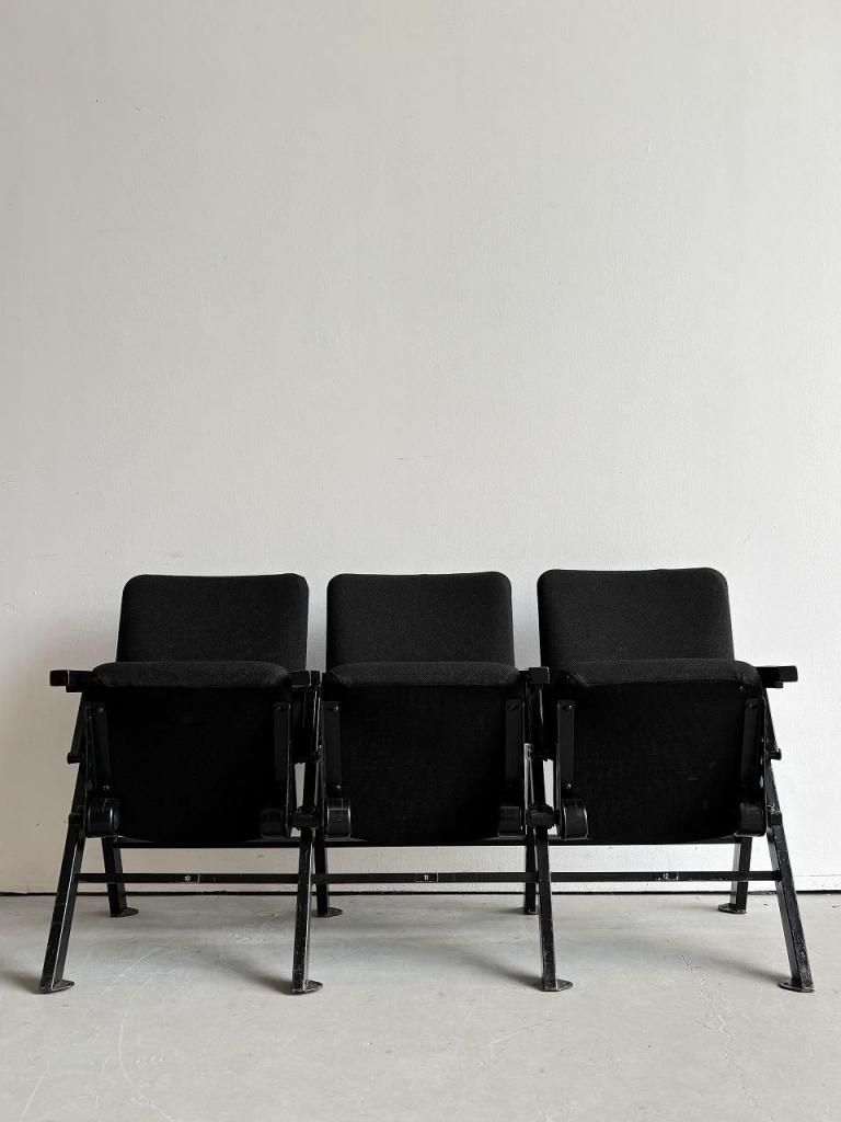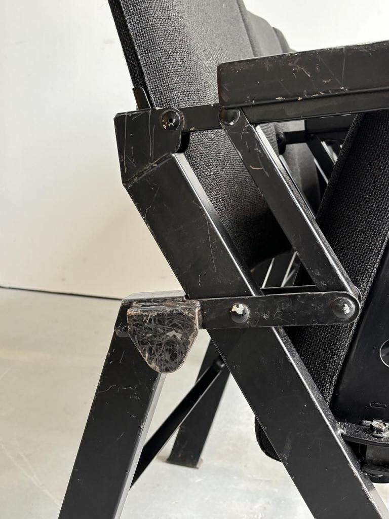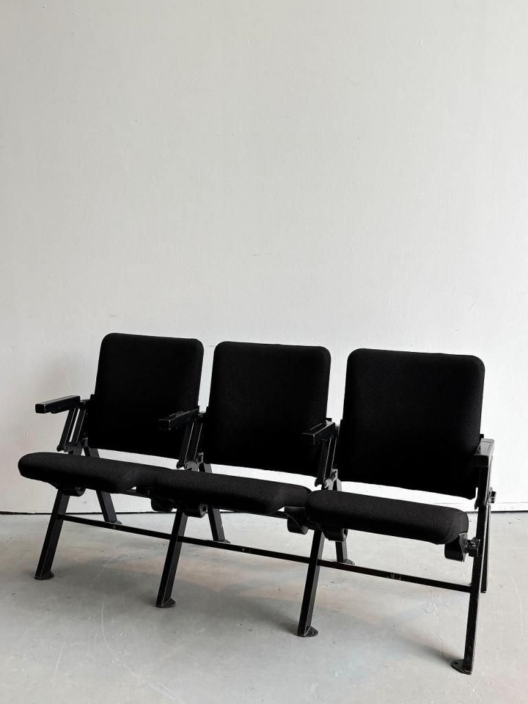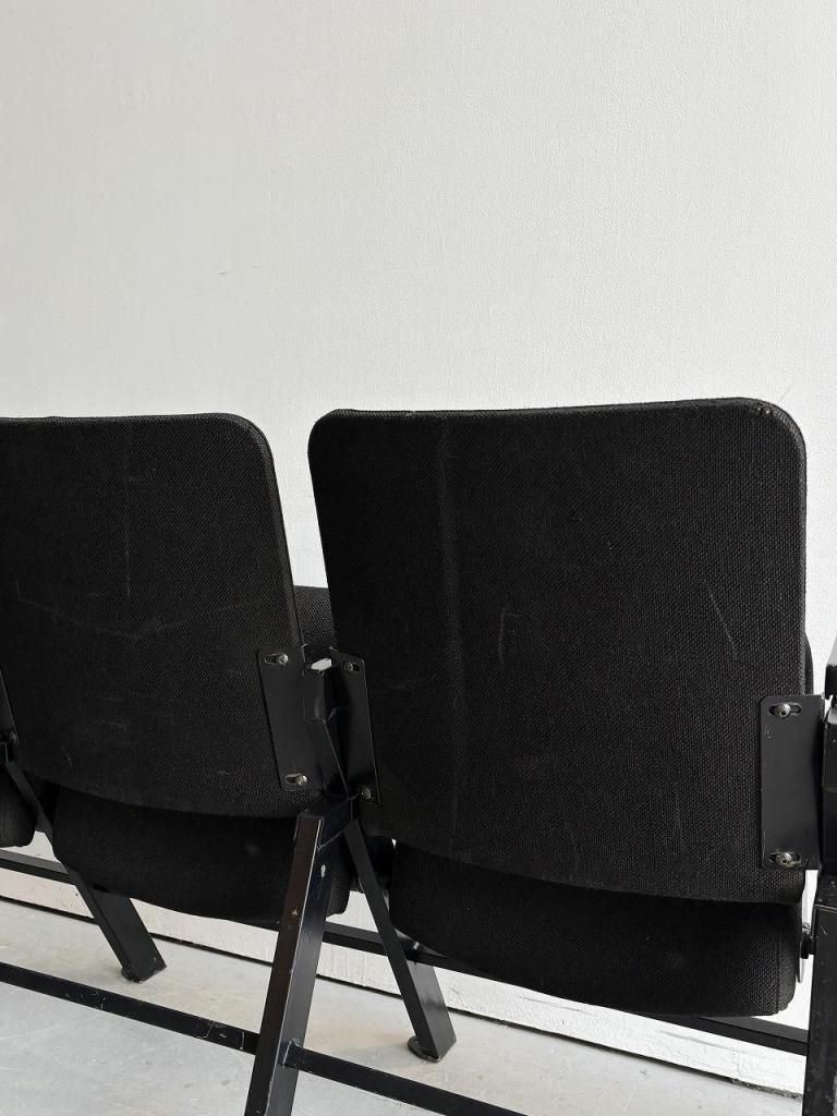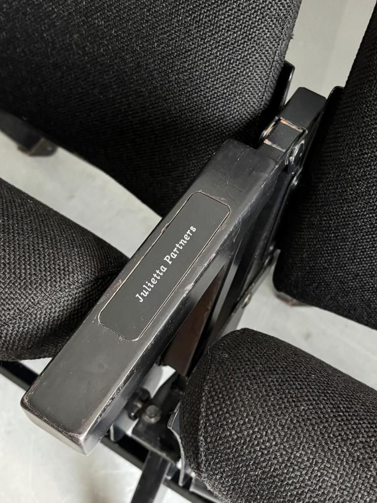座面はアームが連結してフォールディング(跳ね上げ)できる構造で、通路幅を確保できる設計。劇場・講堂・スタジアムなど「人の流れ」を管理することを想定された、実用的な機能です。